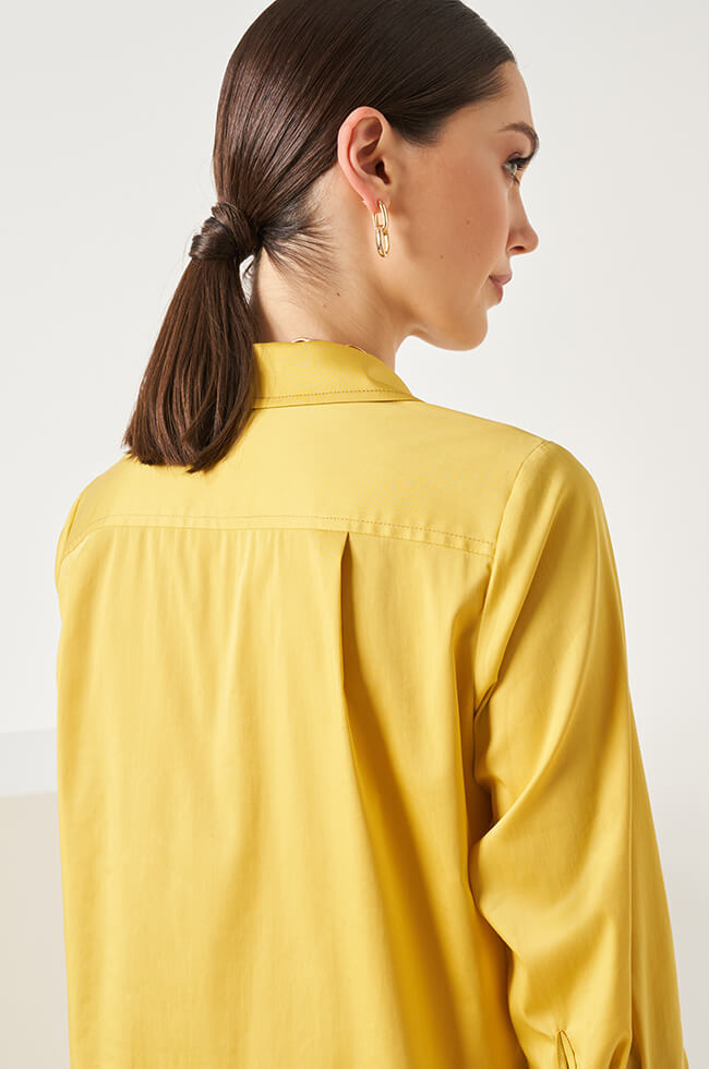Платье-рубашка свободного силуэта с V-образным вырезом горловины с отложным воротником и лацканами. Центральная застежка на контрастные пуговицы. Рукава ¾, сосборены на манжету с разрезом и застежкой на контрастные пуговицы. Спереди нагрудные накладные карманы с клапанами. В боковых швах выполнены потайные карманы. Спинка с кокеткой. Дополняется контрастным поясом-лентой с прямоугольными пряжками.