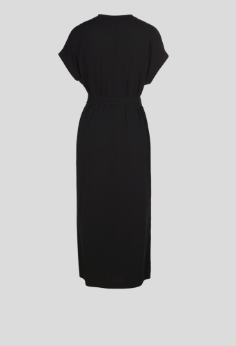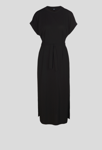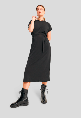 Платье из нежного эластичного вискозного крепа. Оно позволяет коже нежно дышать и благодаря струящейся ткани и завязывающемуся на талии поясу создает красивый женственный силуэт.