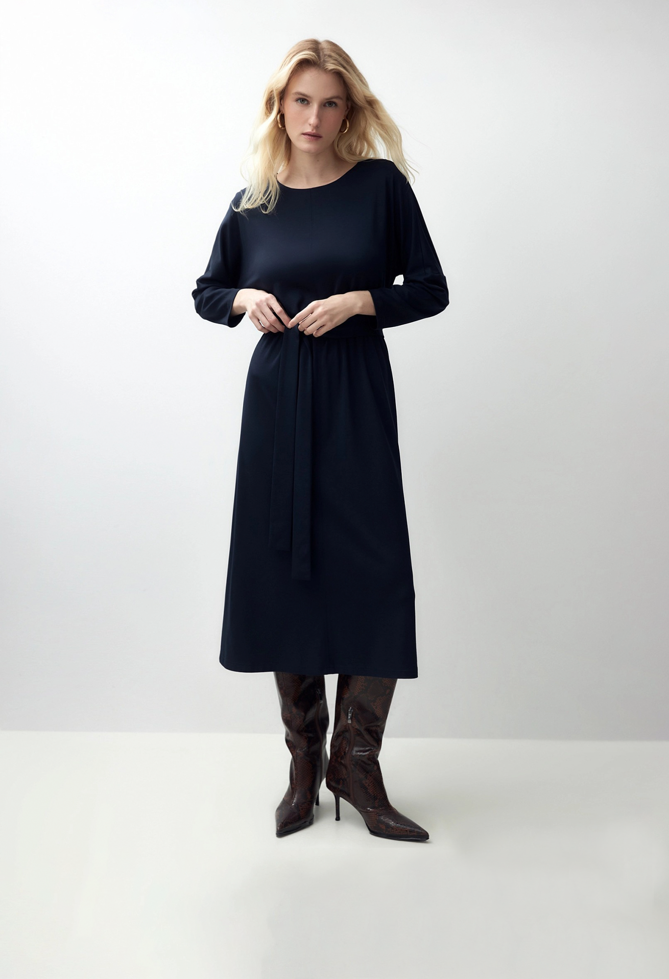 Платье из мягкого и в то же время плотного трикотажа, на эластичном поясе даст вам ощущение свободы движения и комфорта.
