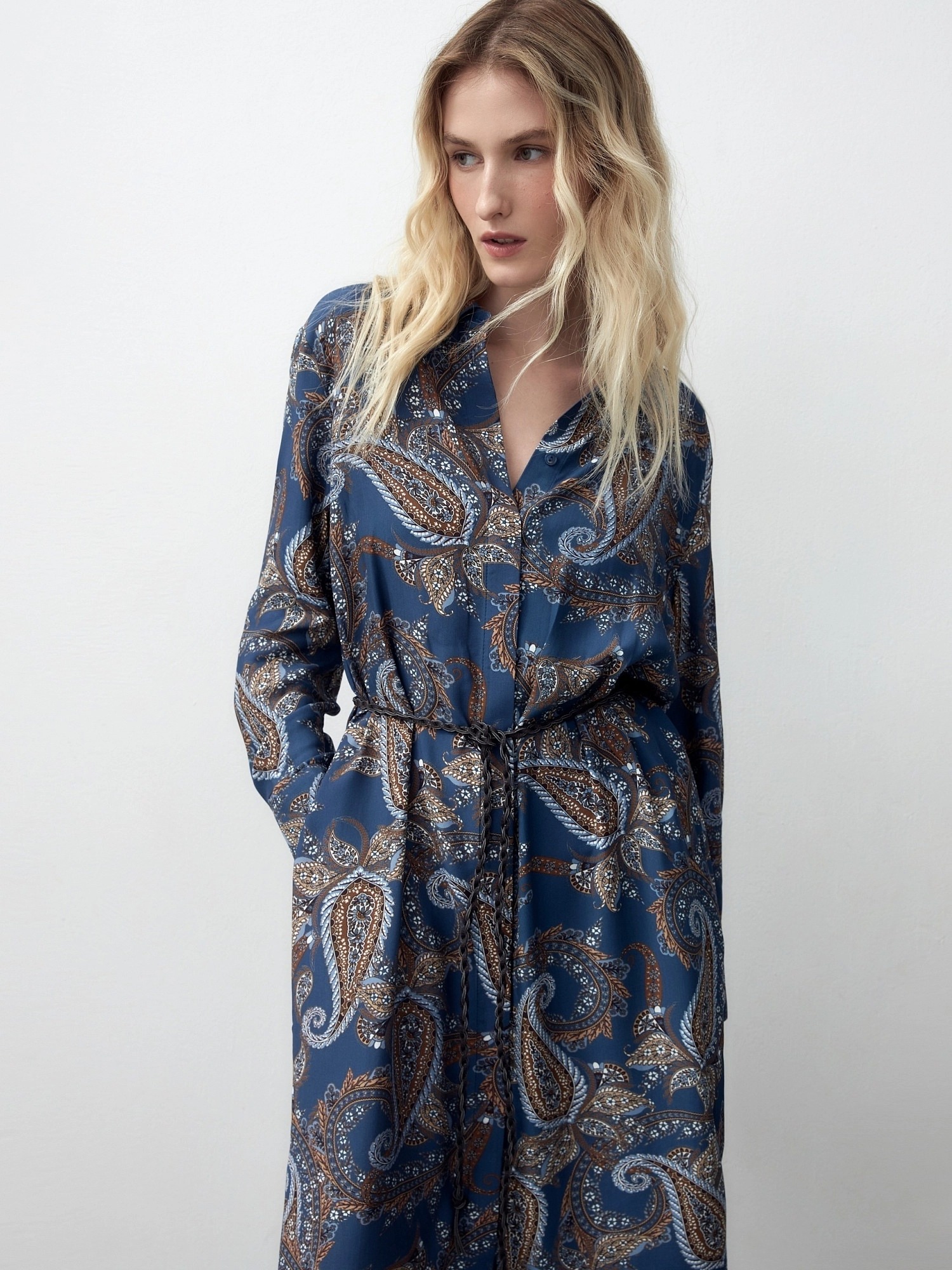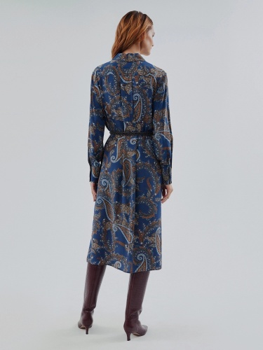 Платье-рубашка из 100% вискозы прямого, свободного силуэта длины миди с классическим отложным воротником и втачным рукавом полной длины на манжете. Застежка спереди потайная на пуговицы, по боковым швам разрезы. В комплект входит крученый тонкий пояс из экокожи для создания более приталенного силуэта.