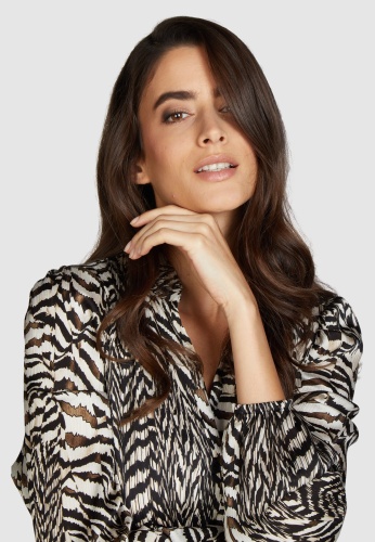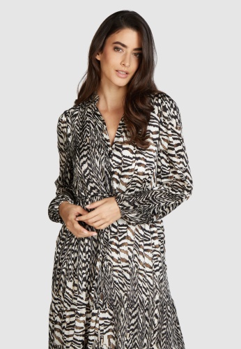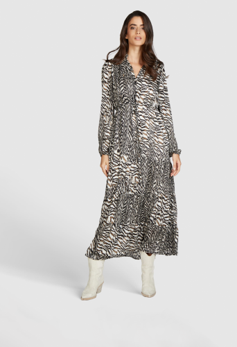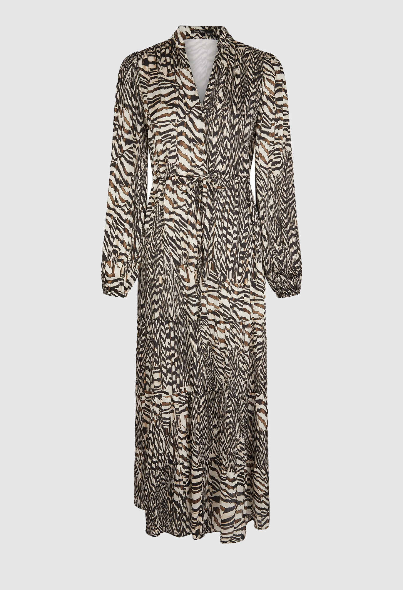 Платье-макси с модным графическим животным принтом из мягкой мятой ткани впечатляет оптической многоярусной юбкой с оборками для увеличения ширины и V-образным вырезом с воротником-стойкой. Эластичная талия с кулиской создает свободный акцент, создавая струящийся образ.