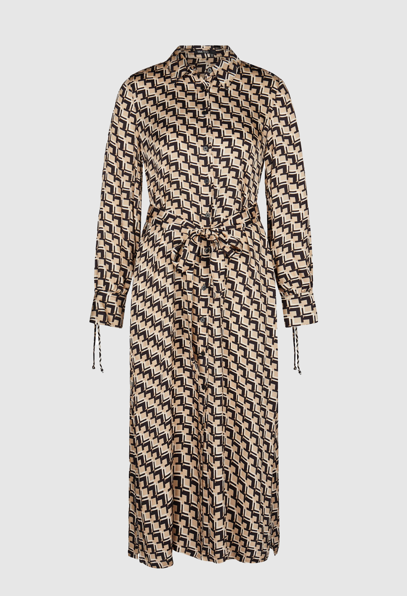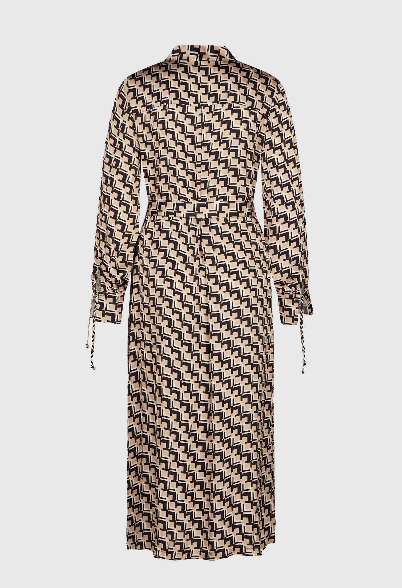 Платье-макси из вискозного атласа впечатляет четкой структурой, рубашечным воротником и заметной планкой на пуговицах. Манжеты с завязками и пояс из внешней ткани расставляют акценты. Модный геометрический принт делает это платье настоящей изюминкой.