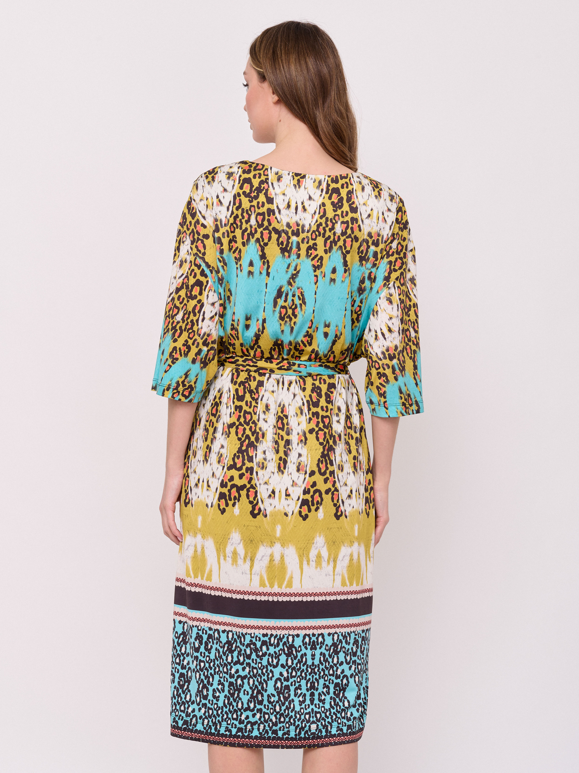 Детали: без застежки, вырез горловины округлый, рукава 3/4, покрой прямой, рисунок орнамент, без карманов, конструктивные элементы пояс, длина платья миди, нижний слой. Длина по спинке: 115 см.