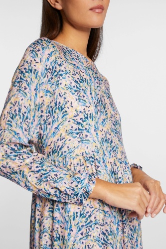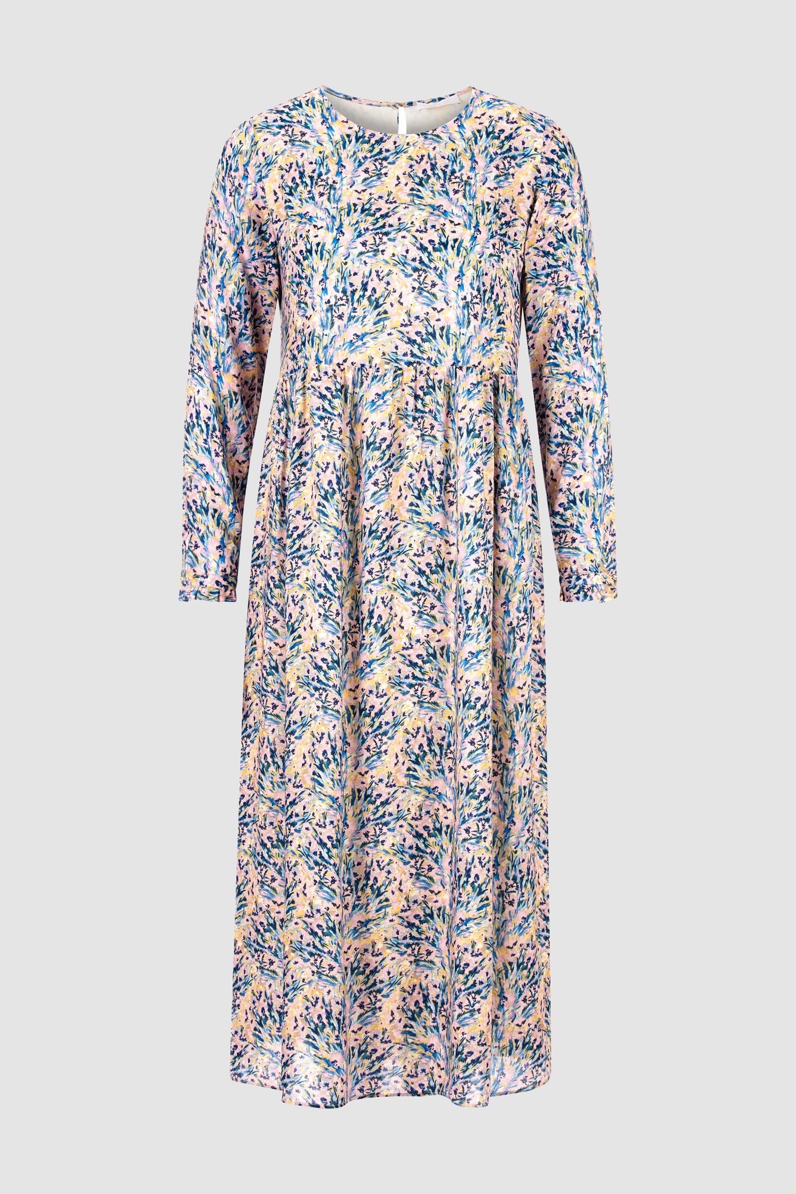 Платье удивительно женственное с романтическим цветочным узором. Верх свободного кроя, юбка длины миди имеет широкую, ниспадающую форму. Оборки на манжетах рукавов и изящная пуговица на шее подчеркивают игривый образ.