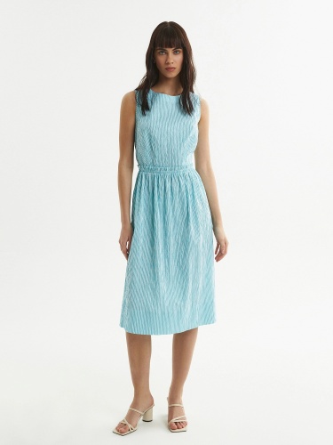 Романтичное приталенное платье без рукавов, из фактурной плательной ткани с бирюзовой полоской. С расширенной юбкой на резинке и рюшем на талии.