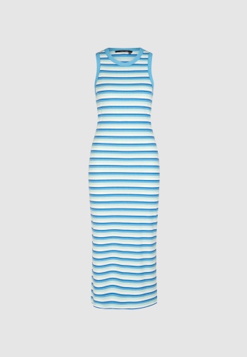 Платье-майка с модным узором в полоску изготовлено из мягкого вискозного трикотажа, обеспечивающего комфортную посадку. Оно выделяется круглым вырезом и узким кроем. Практичная длина миди создает эффектный силуэт.