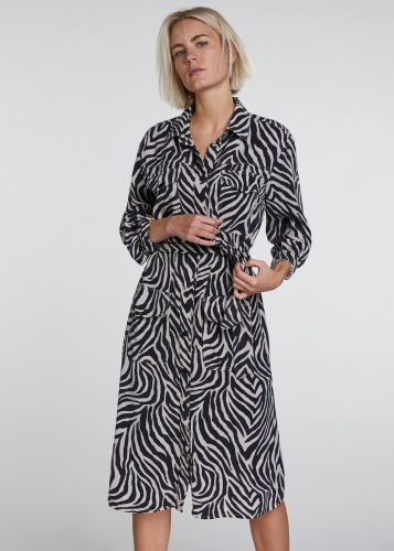 Платье миди в анималистичной расцветке. Отложной рубашечный воротник, планка с пуговицами. Благодаря тканевому поясу можно сделать силуэт приталенным. Втачной рукав полной длины с манжетой.
