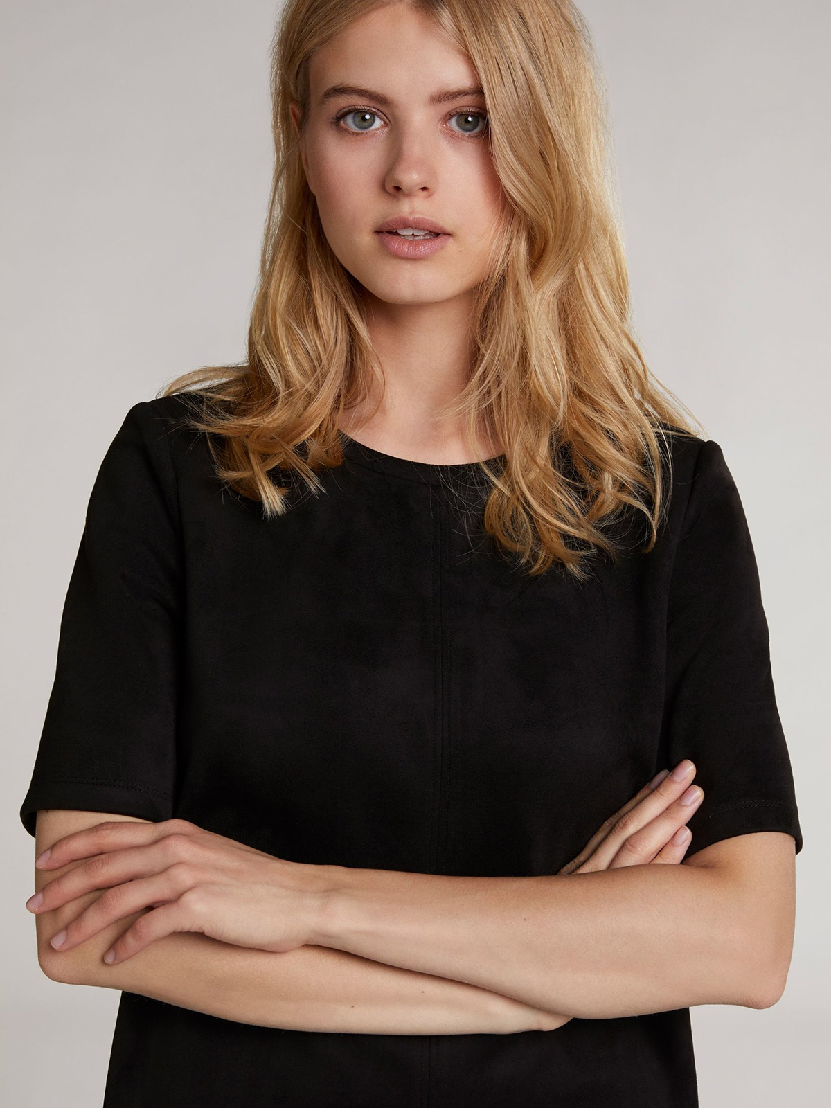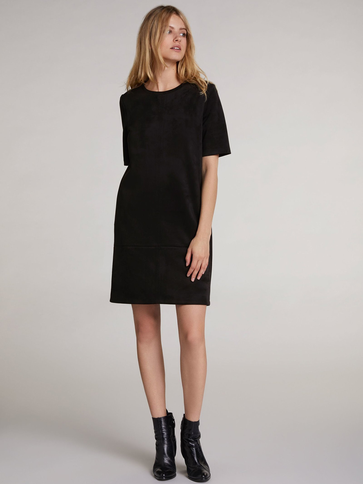 Черное мини-платье прямого кроя выполнено под замшу. Круглый вырез горловины, корткий втачной рукав. Врезные карманы с листочкой из экокожи являются стильным акцентом.