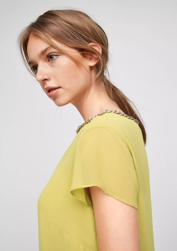 Однотонное платье прямого кроя с коротким цельнокроенным рукавом. Застежка на скрытую молнию сзади, овальный вырез горловины украшен цепочкой.