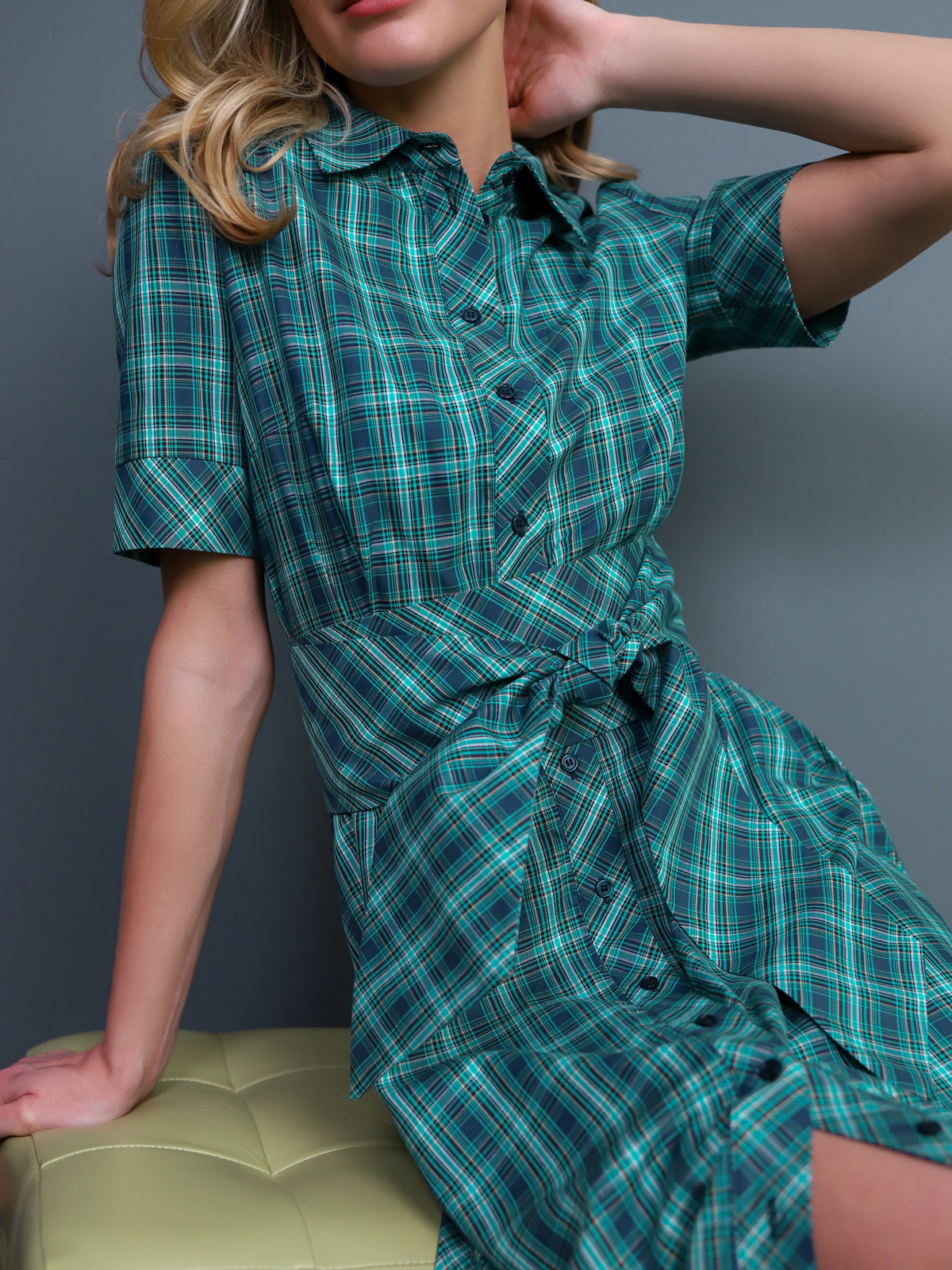 Платье из костюмной ткани в клетку приталенного силуэта с широкой юбкой А-силуэта, классическим отложным воротником, коротким рукавом кимоно и застежкой спереди на пуговицы. На талии широкий завязывающийся съемный пояс из основной ткани.