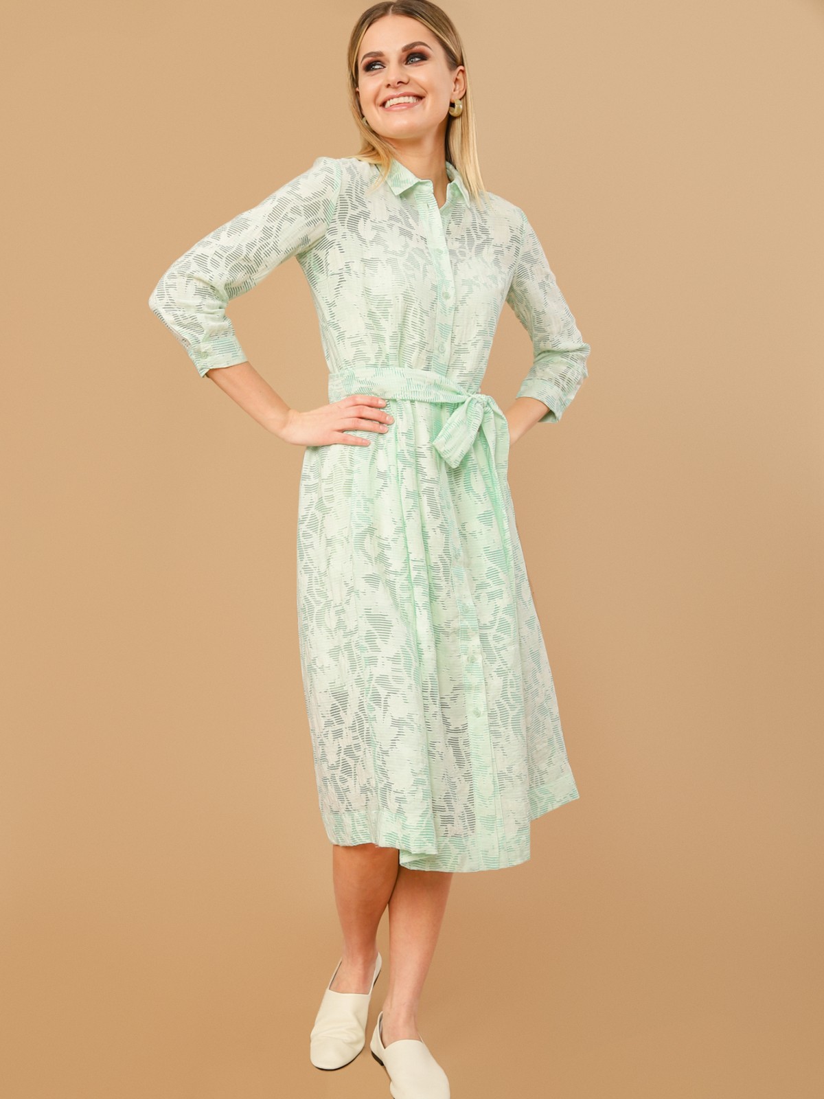 Платье-рубашка из плательной ткани с принтом. Силуэт трапеция, классический отложной воротник, втачной рукав на манжете, застежка спереди на пуговицы. На талии съемный пояс из основной ткани.