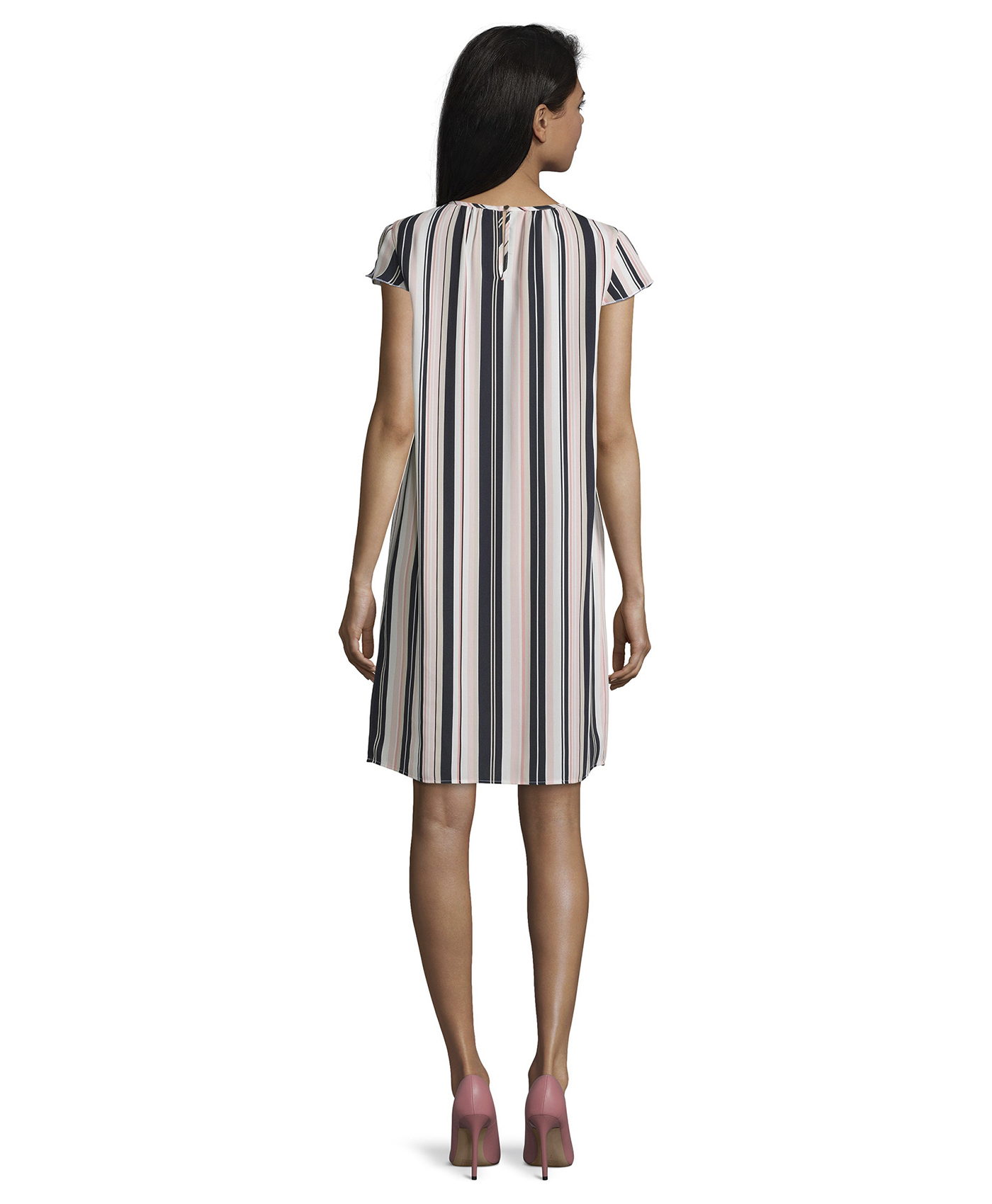 Легкое летнее платье - идеальный вариант для жаркой погоды. Трендовый принт в полоску визуально вытягивает силуэт. Платье свободного покроя, круглый вырез горловины, короткие рукава. Стильное платье отлично смотрится как с туфлями, так и со спортивной обувью.