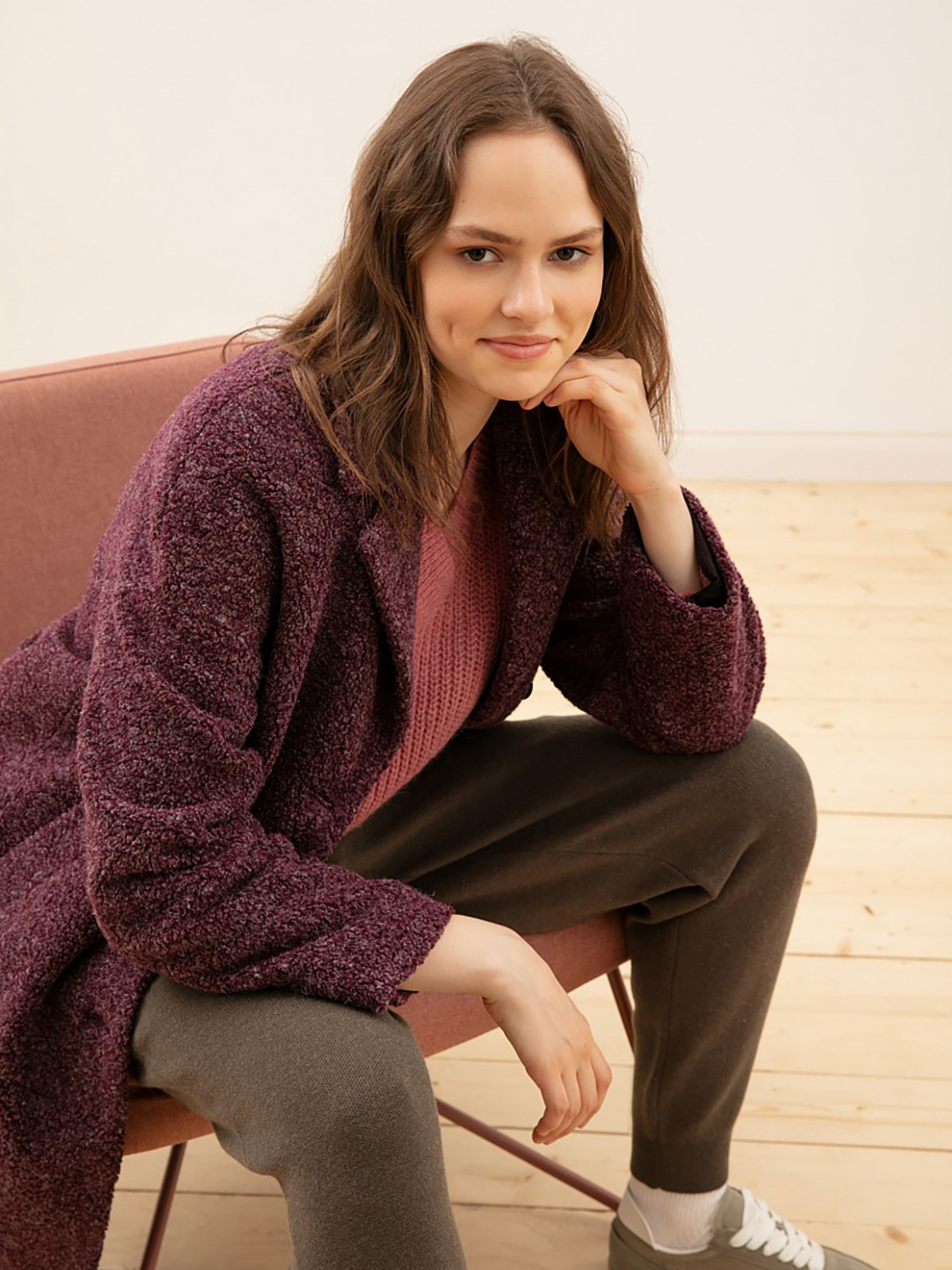 Однотонное повседневное пальто с крупным ворсом. Насыщенный ежевичный задаст тон всего образа. Силуэт кокон, длина ниже колена, застежка на пуговицу и кнопку.