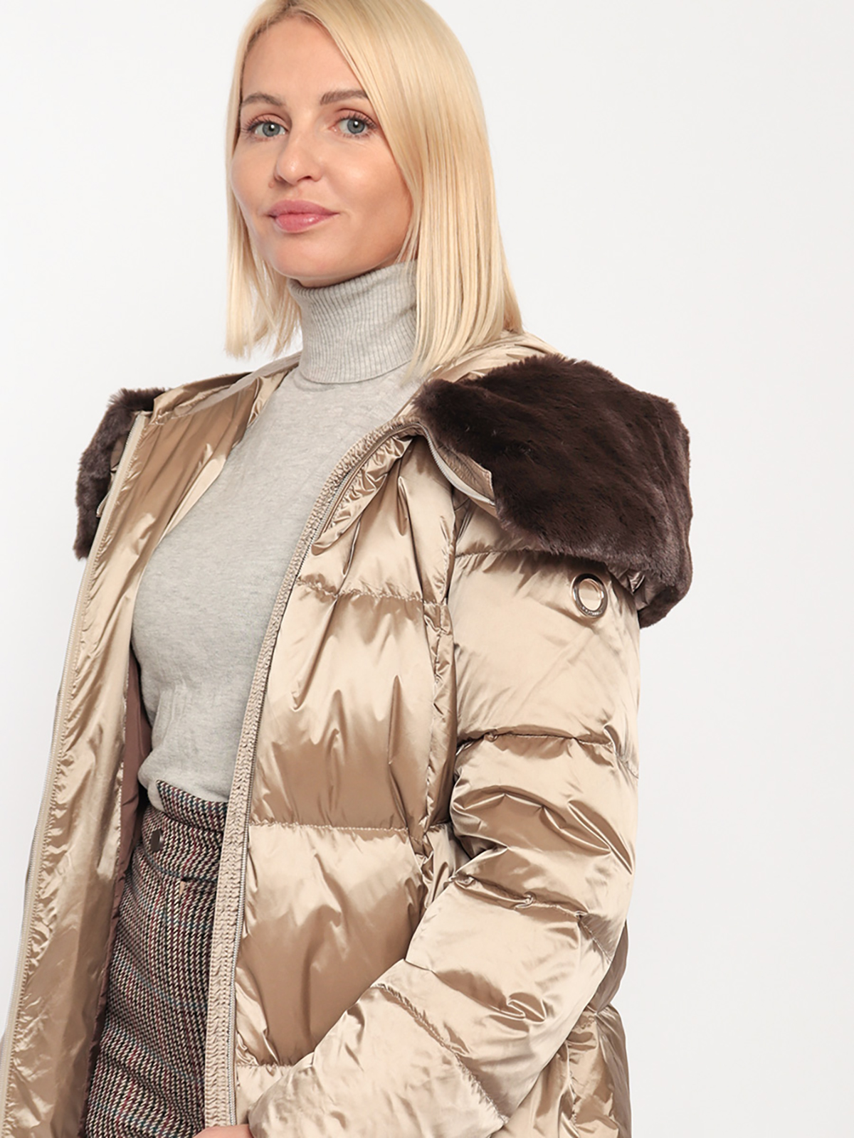 Стеганая зимняя куртка с пуховым наполнителем. Универсальная модель дополнит любой наряд. Воротник стойка со съемной меховой оттелкой, капюшон на молнии. Застежка на двустороннюю молнию. Два боковых кармана на молнии.