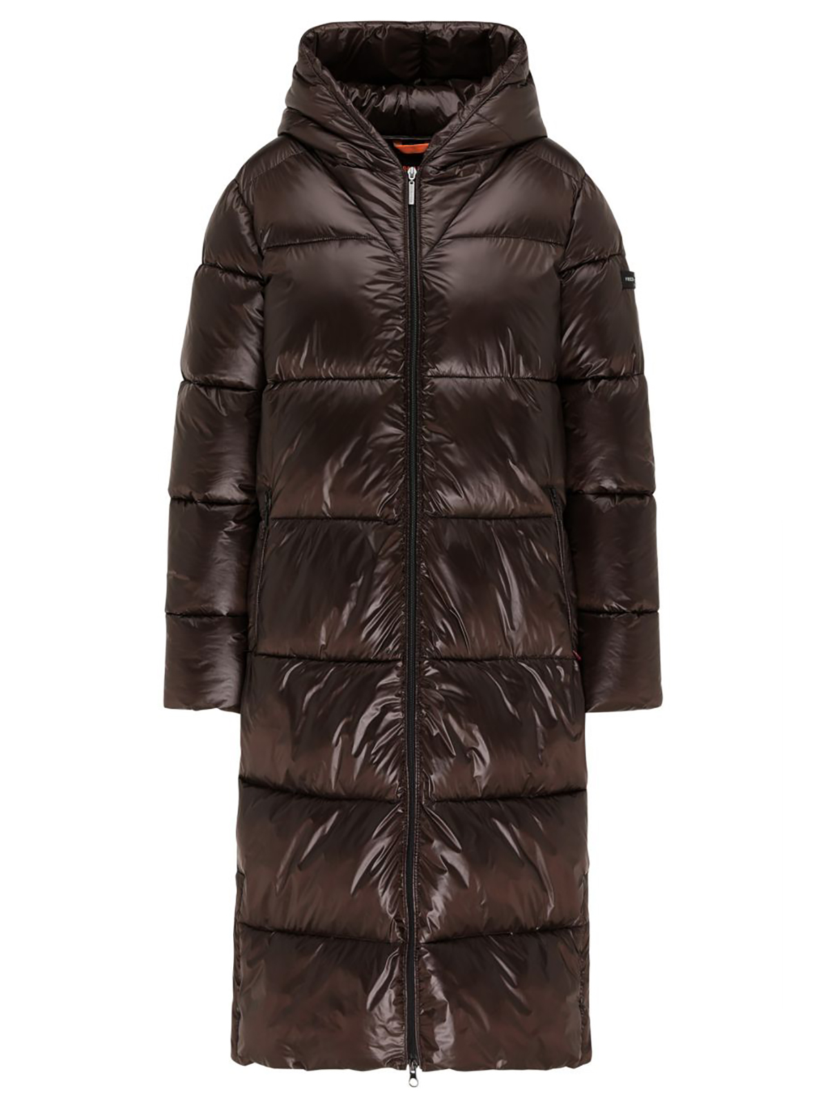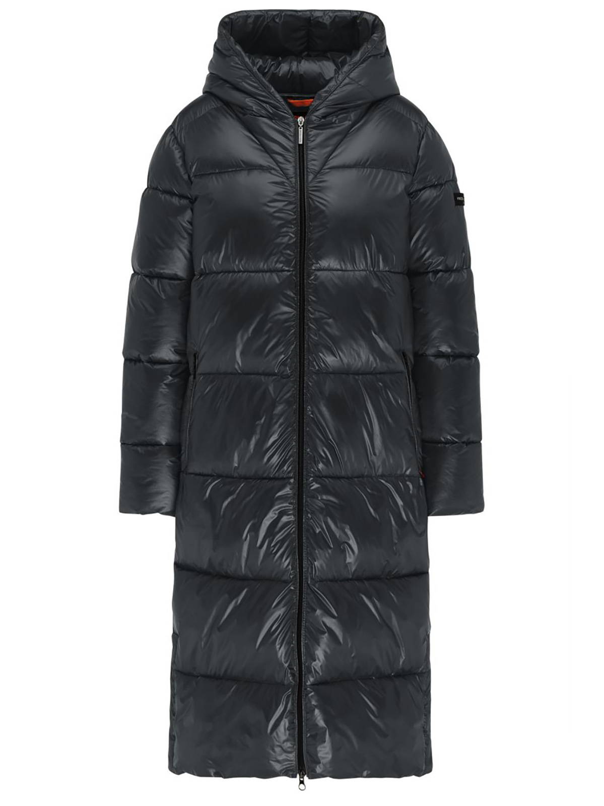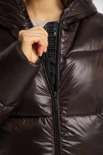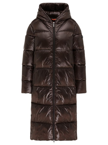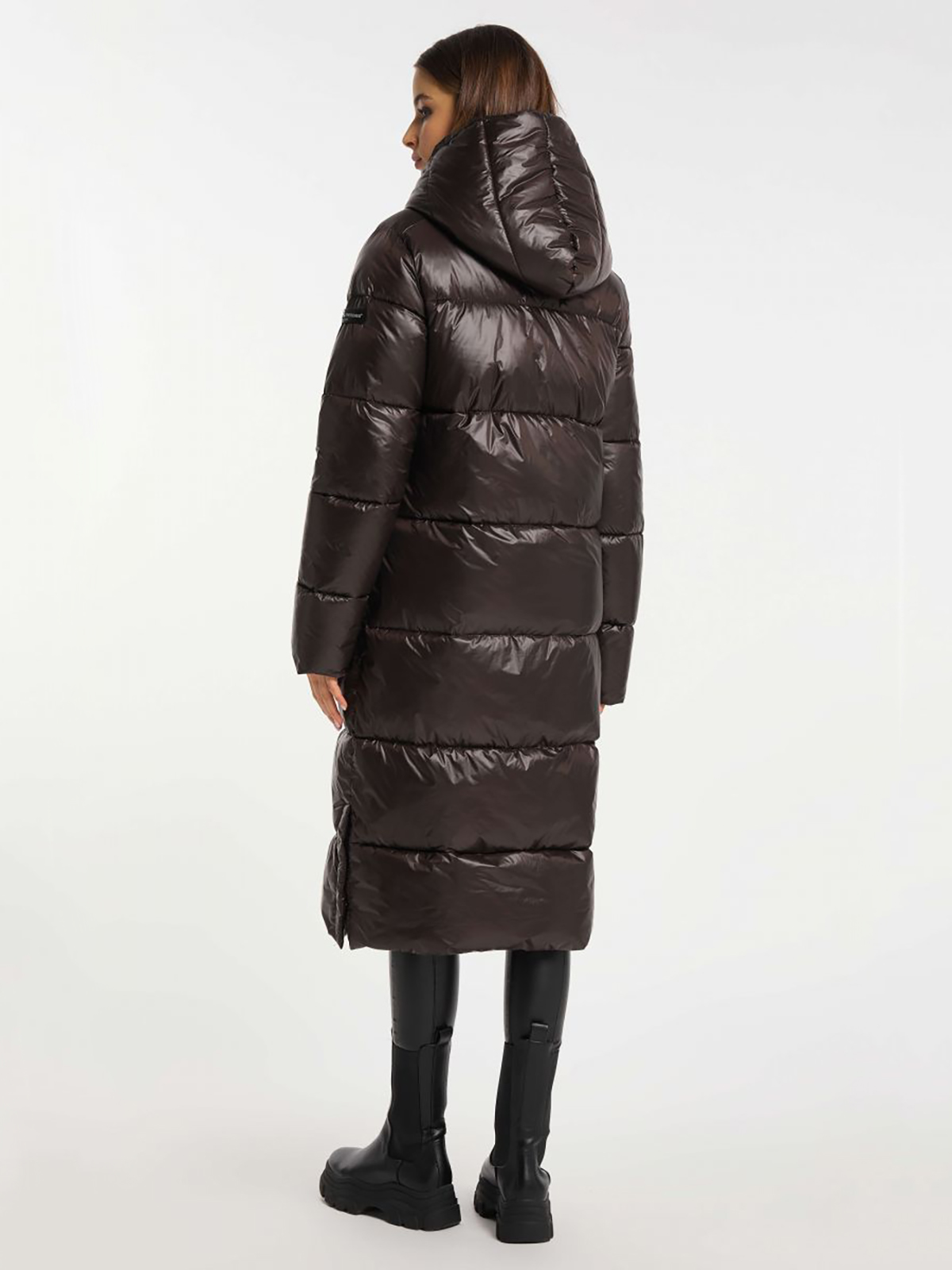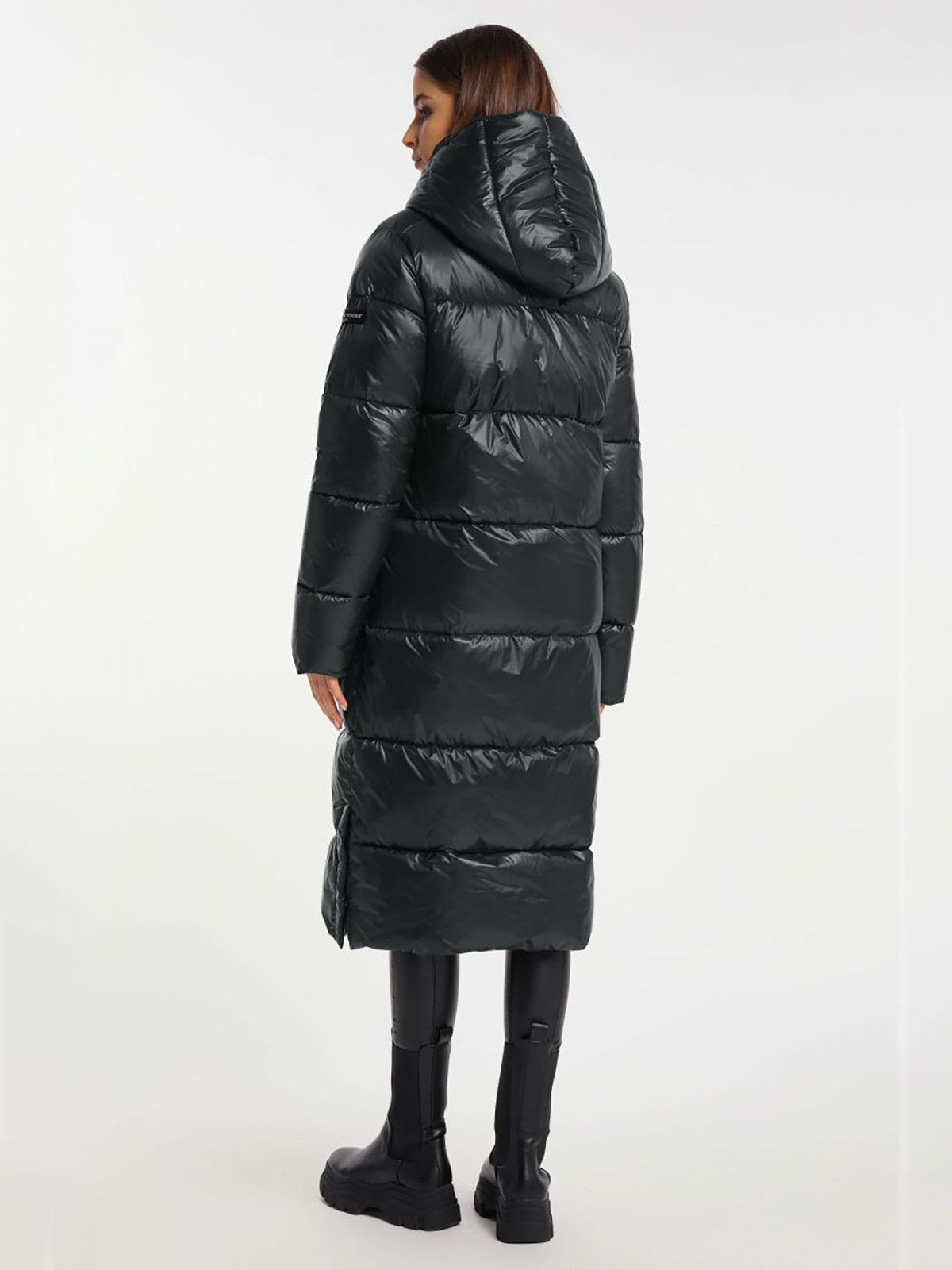 Однотонные зимнее пальто длиной ниже колена. Синтепоновый наполнитель. Застежка на молнию, воротник стойка, объемный капюшон. Два боковых кармана с листочкой, плюс внутренний карман.