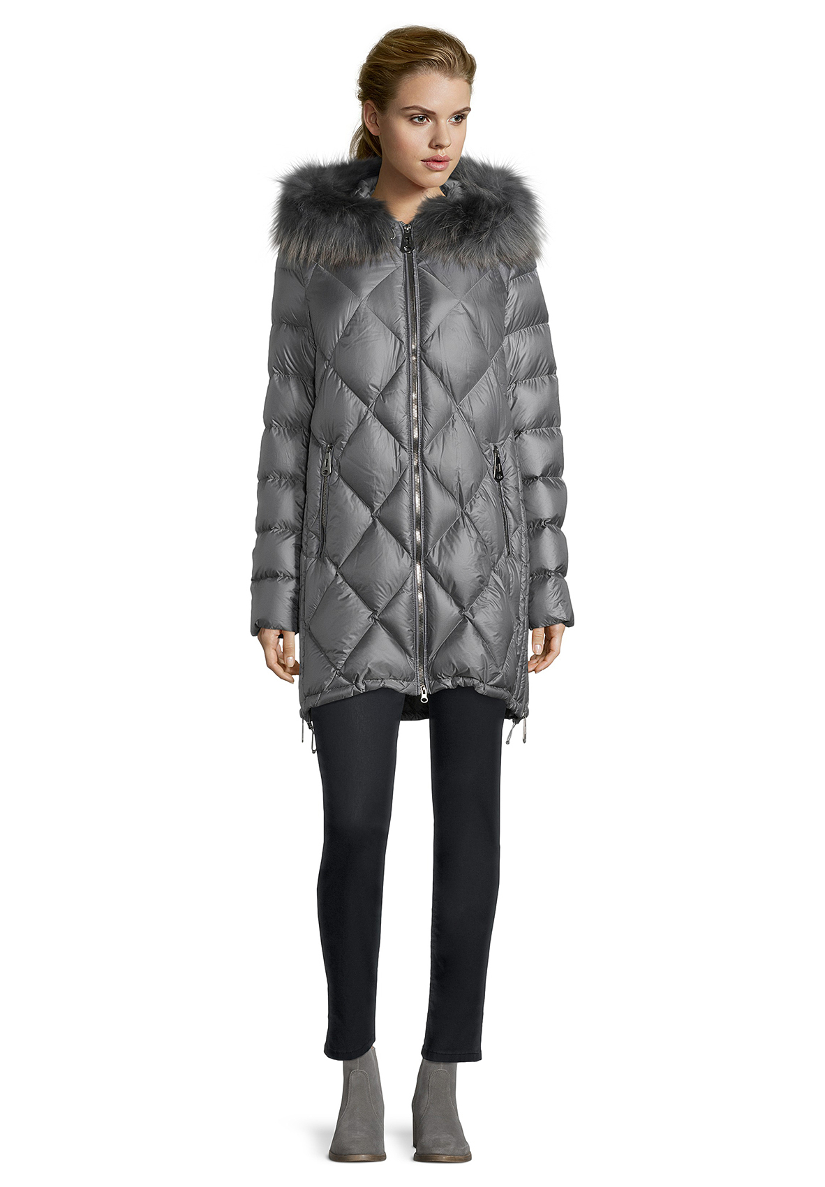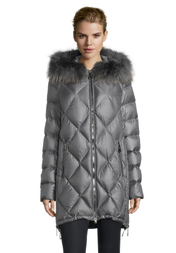 Пуховое пальто прямого покроя. Длина до середины бедра, капюшон на кулиске, двойная застежка-молния, карманы на молниях. Низ изделия на кулиске, что позволяет регулировать прилегание пуховика. Материал верха отлично защищает от ветра и влаги. Отделка капюшона из натурального меха енота придает образу истинный шик.