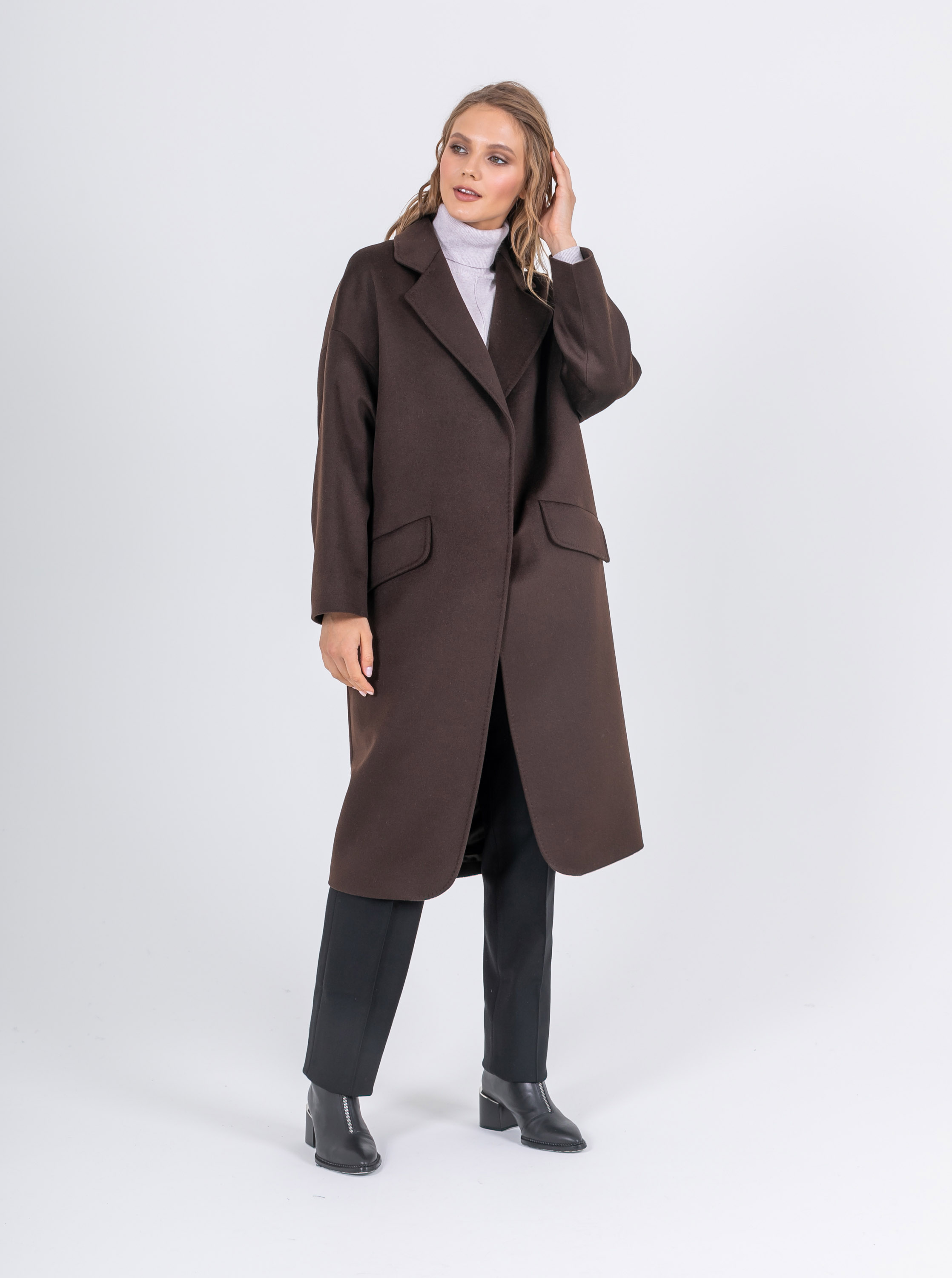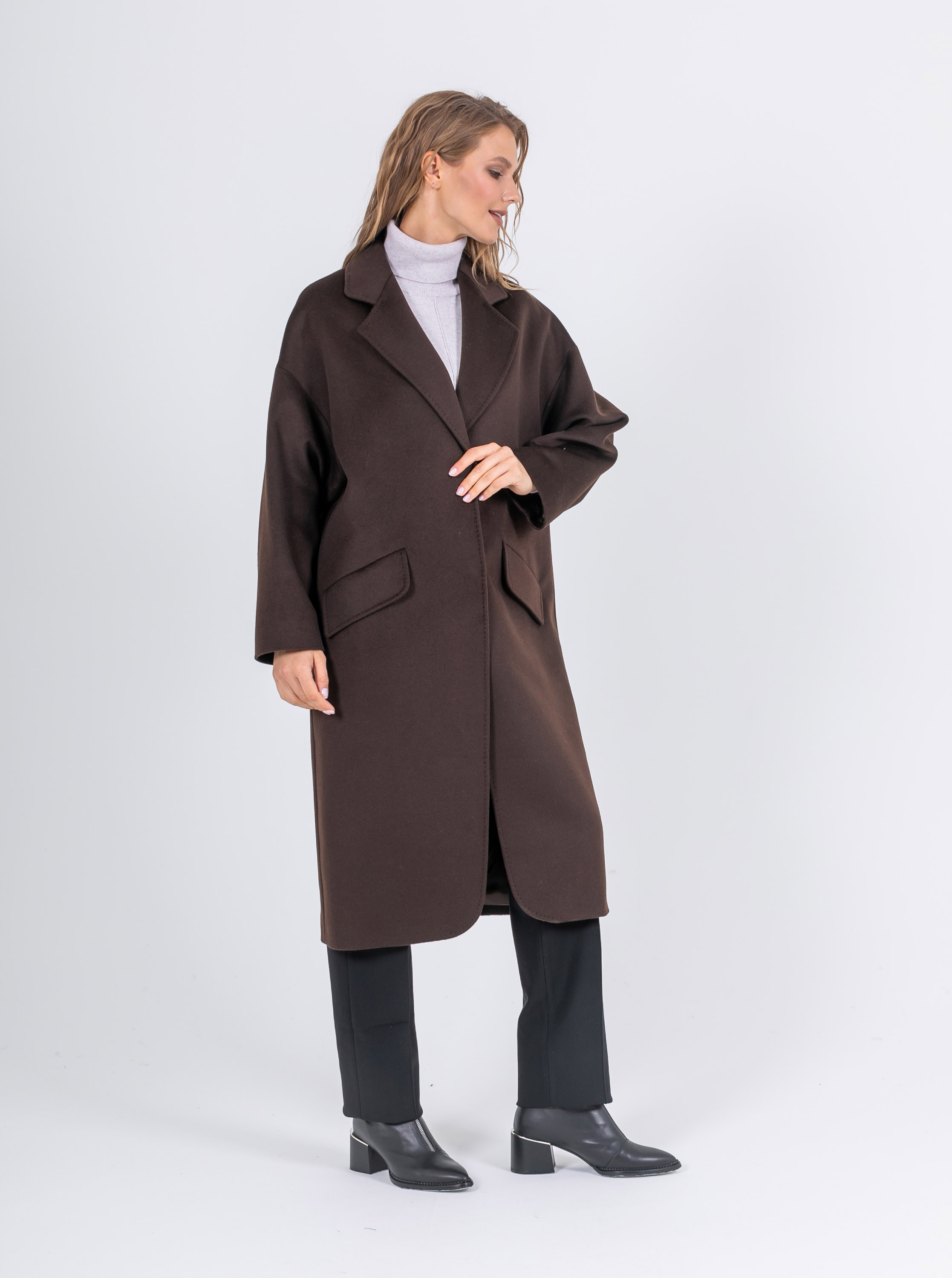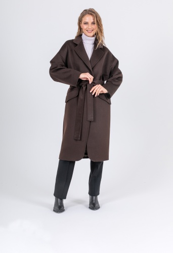 На сайте указаны российские размеры. Свободное пальто классического кроя из 100% шерсти. Свободный рукав, спущенное плечо, скрытые карманы, английский воротник. Модель с закруглёнными углами снизу. С поясом. Рост модели: 174 см