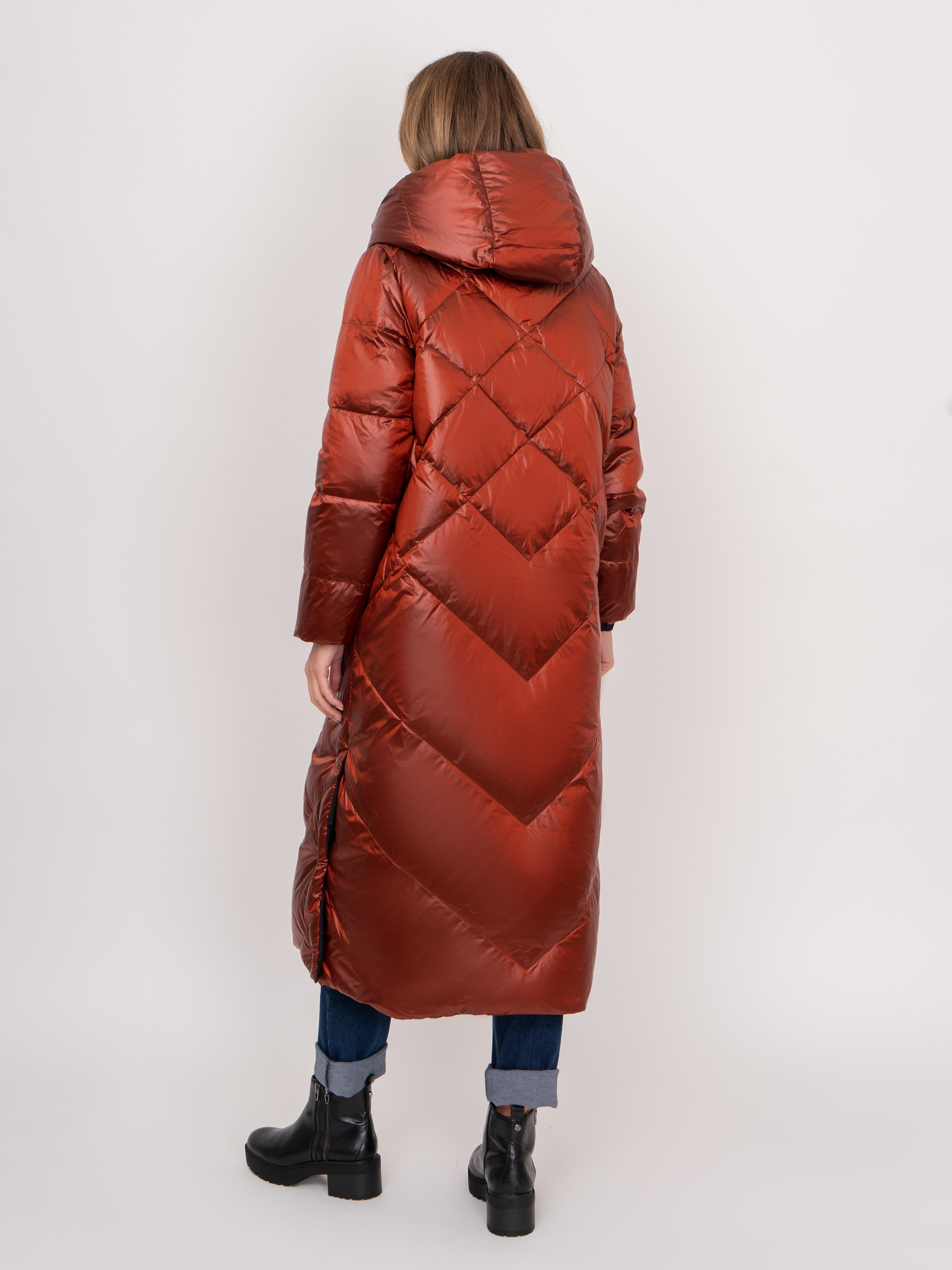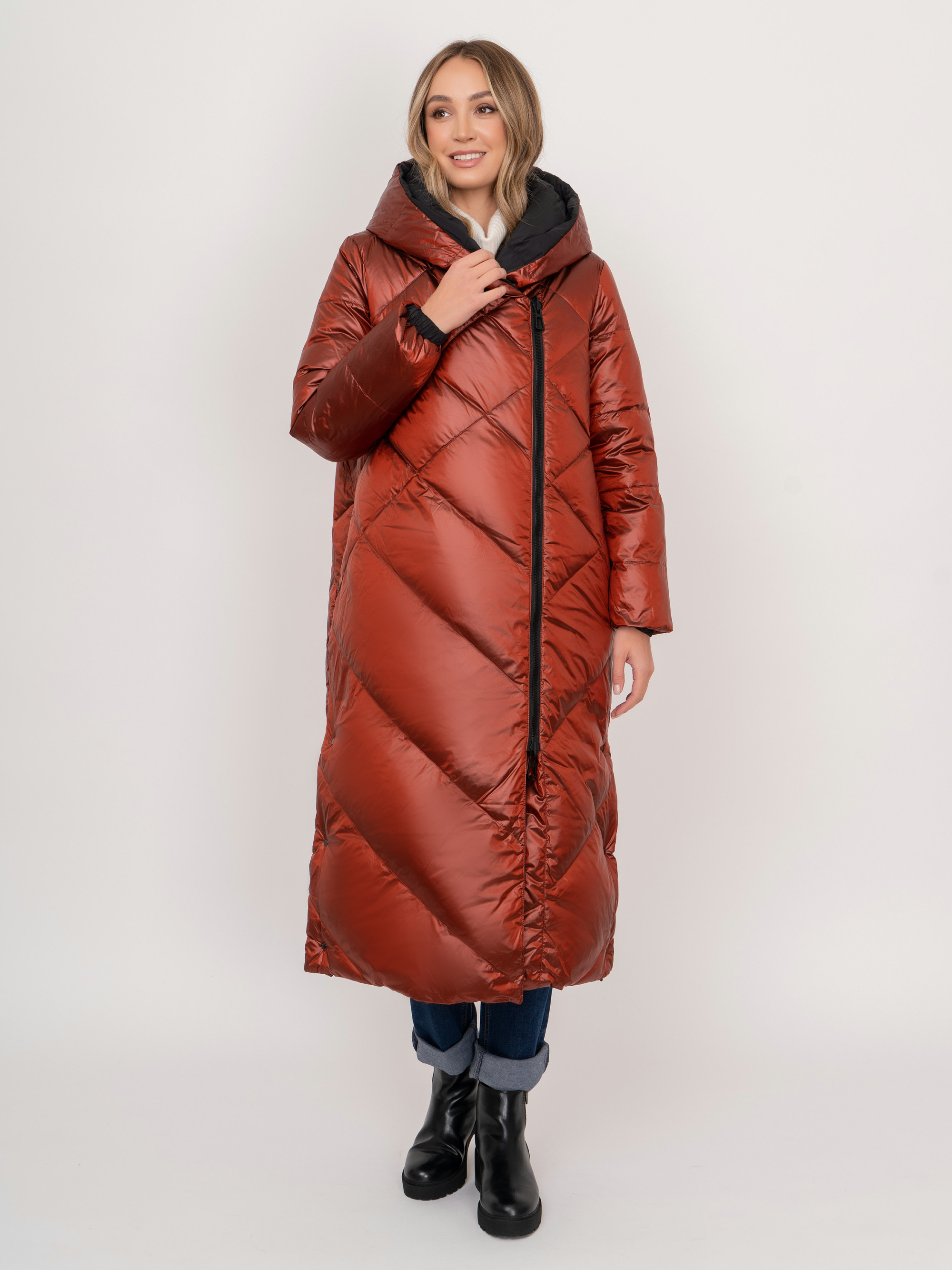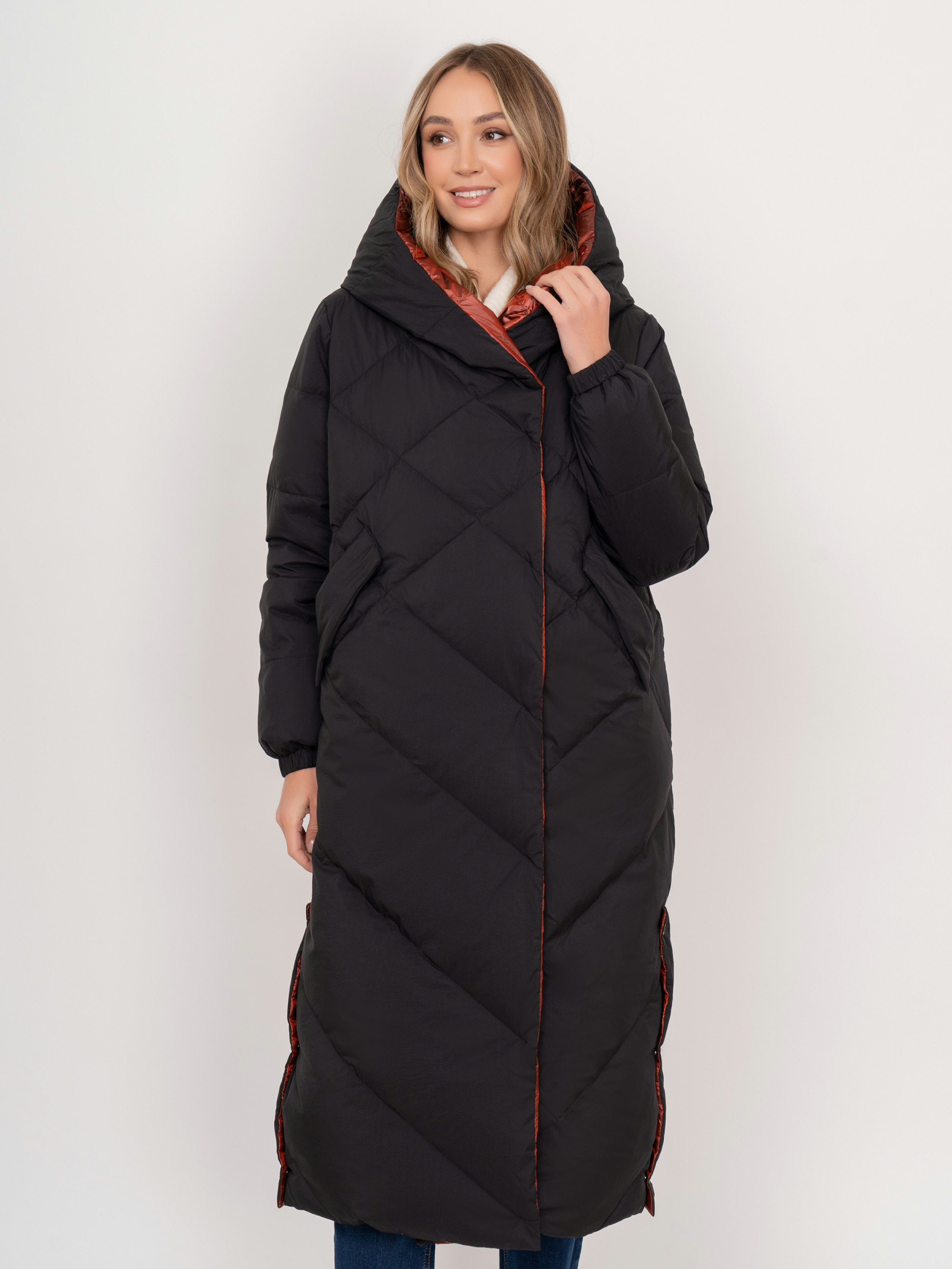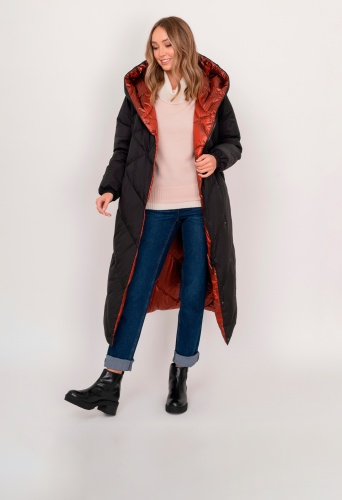 На сайте указаны российские размеры. Двустороннее утепленное черно-терракотовое пальто на молнии и кнопках, с длинным рукавом, с прорезными карманами, с трикотажными манжетами, с боковыми разрезами на кнопках. Рост модели: 175 см. Длина пальто: 119 см.