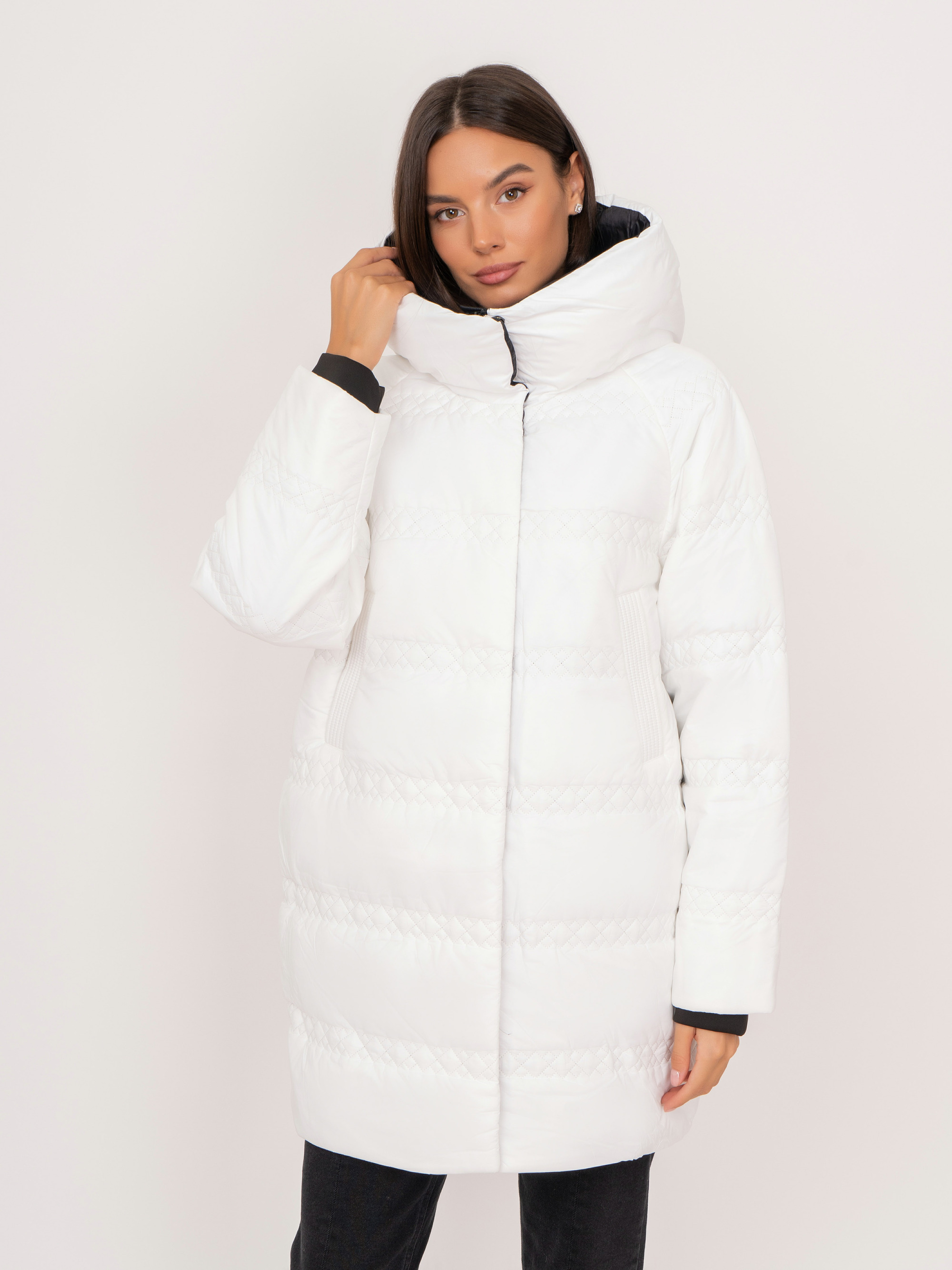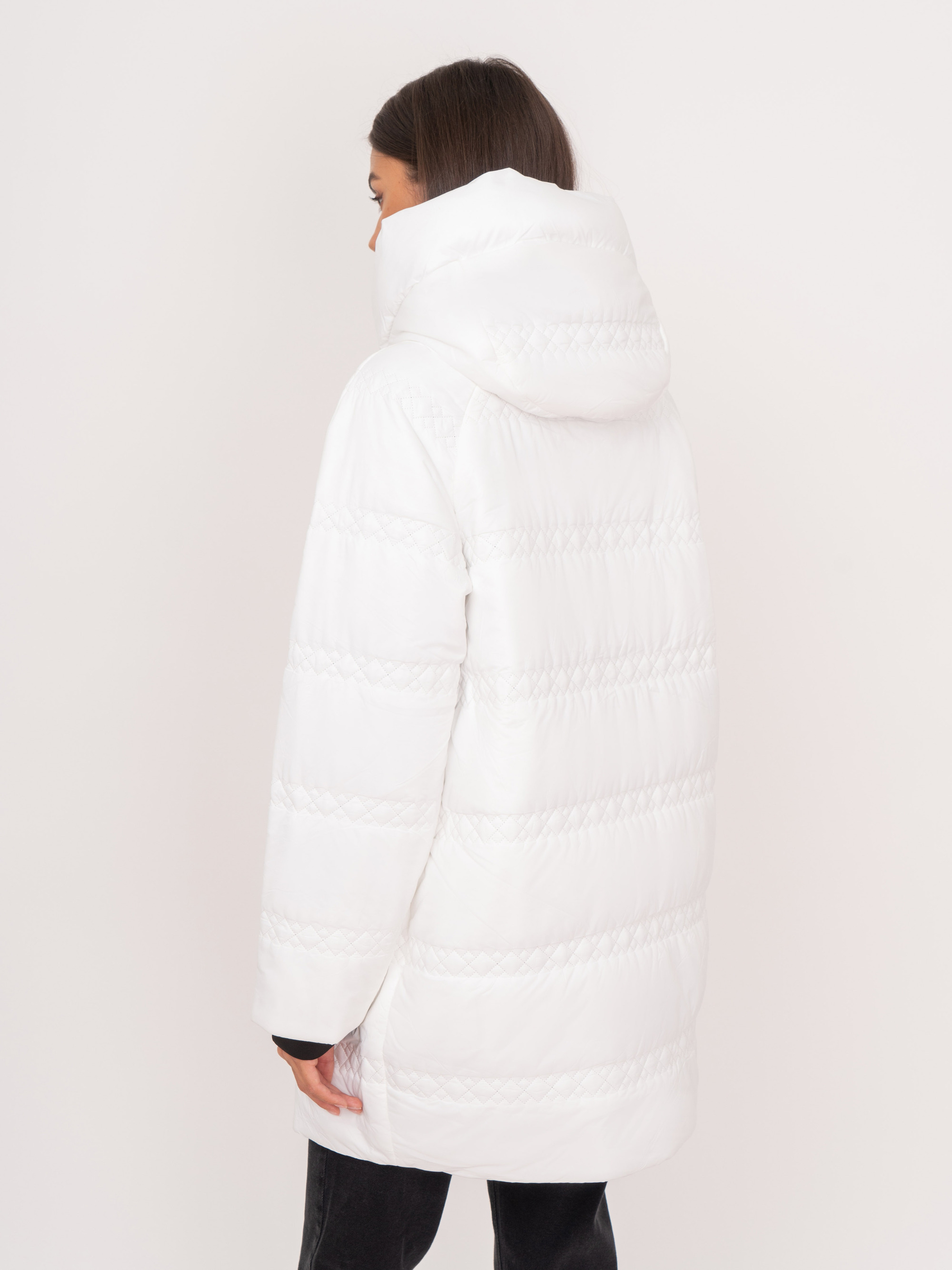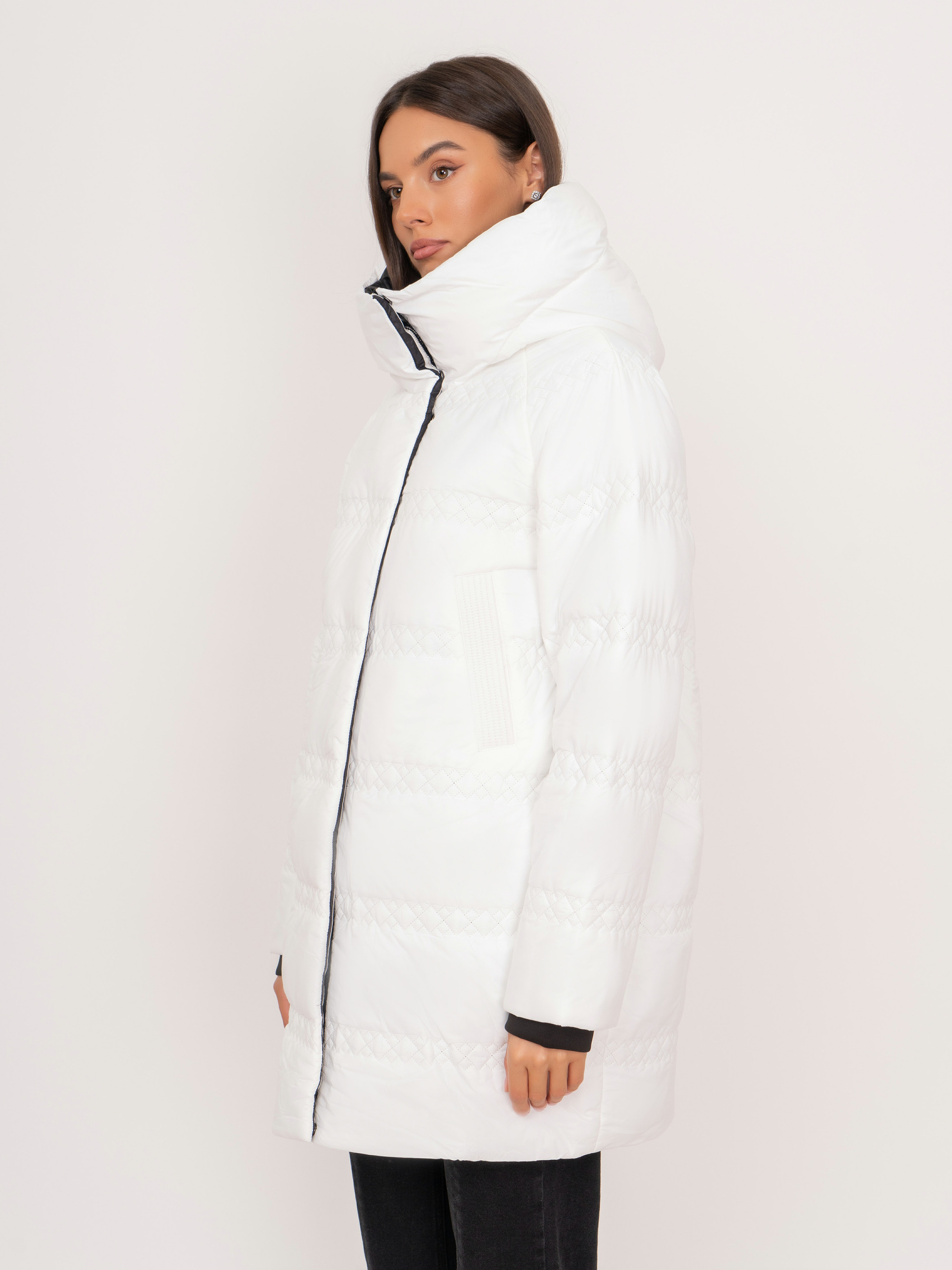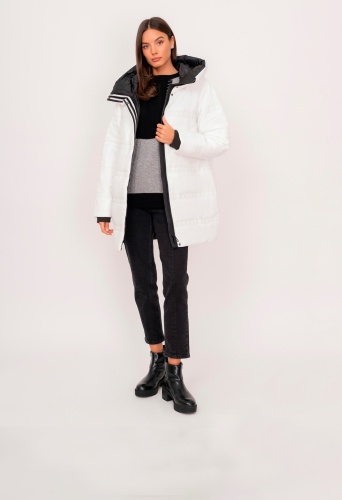 На сайте указаны российские размеры. Прямая утепленная белая куртка на молнии и кнопках, с капюшоном, с прорезными карманами. Рост модели: 175 см. Длина куртки: 80 см.