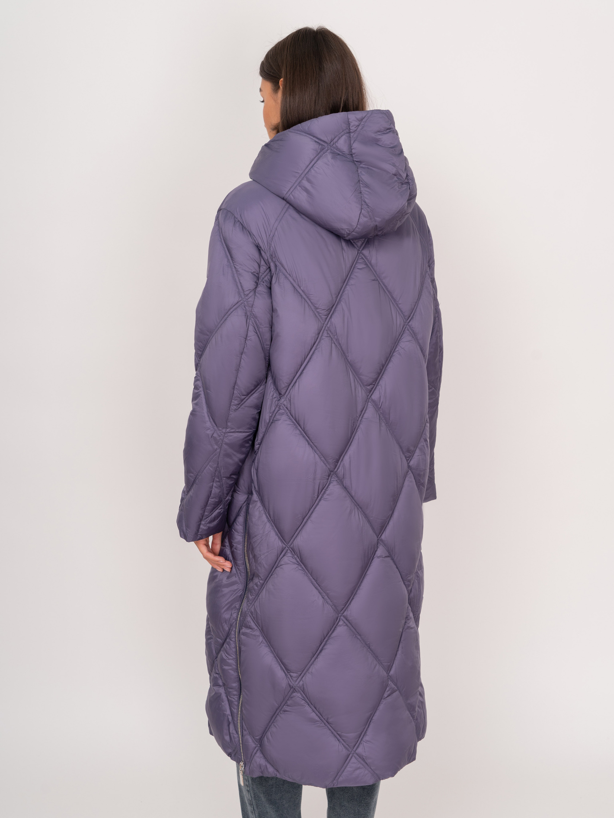 На сайте указаны российские размеры. Прямое стеганое утепленное фиолетовое пальто на молнии, с капюшоном, с длинным рукавом, с прорезными карманами на кнопках. Рост модели: 175 см. Длина куртки: 114 см.