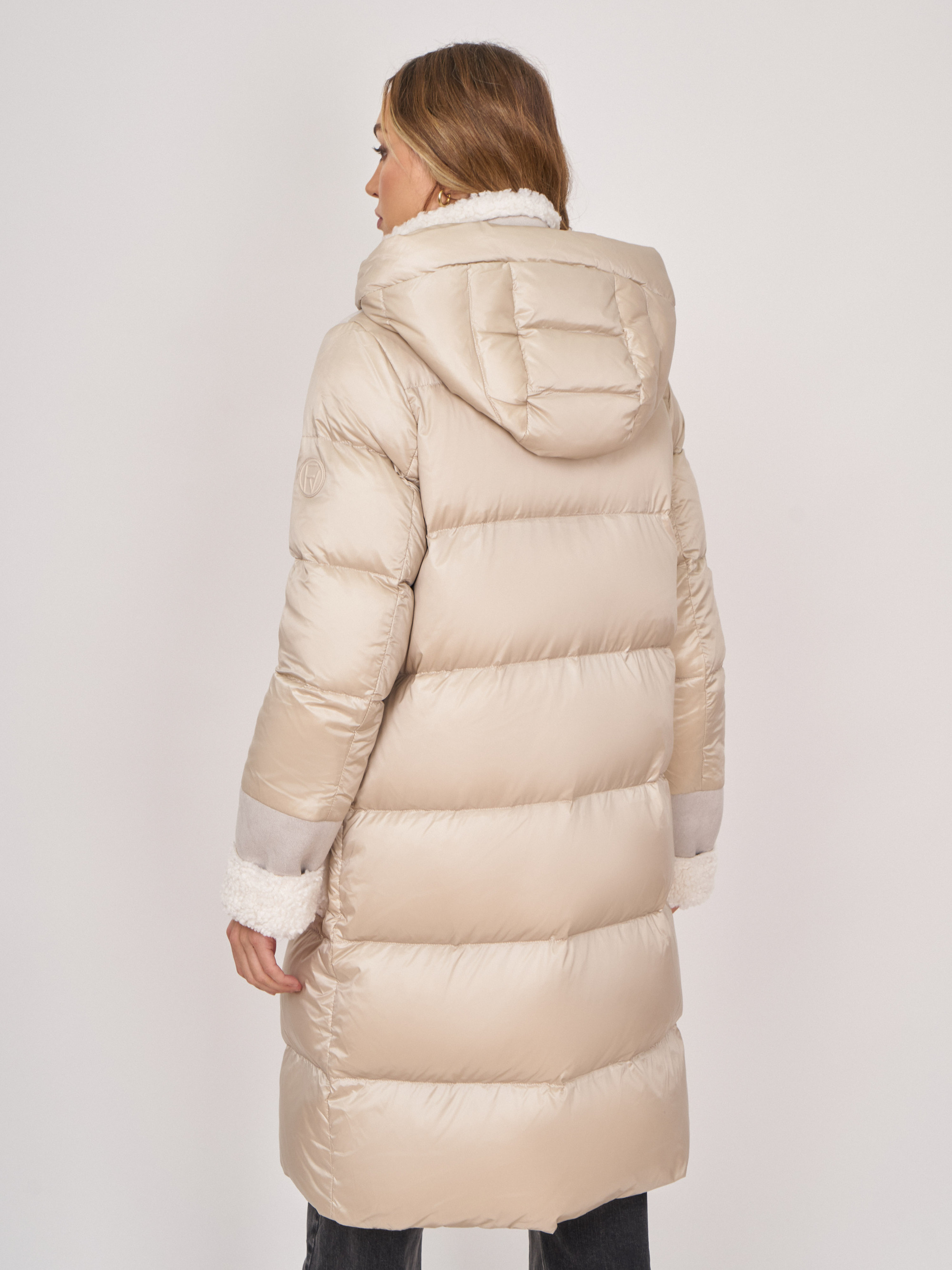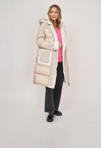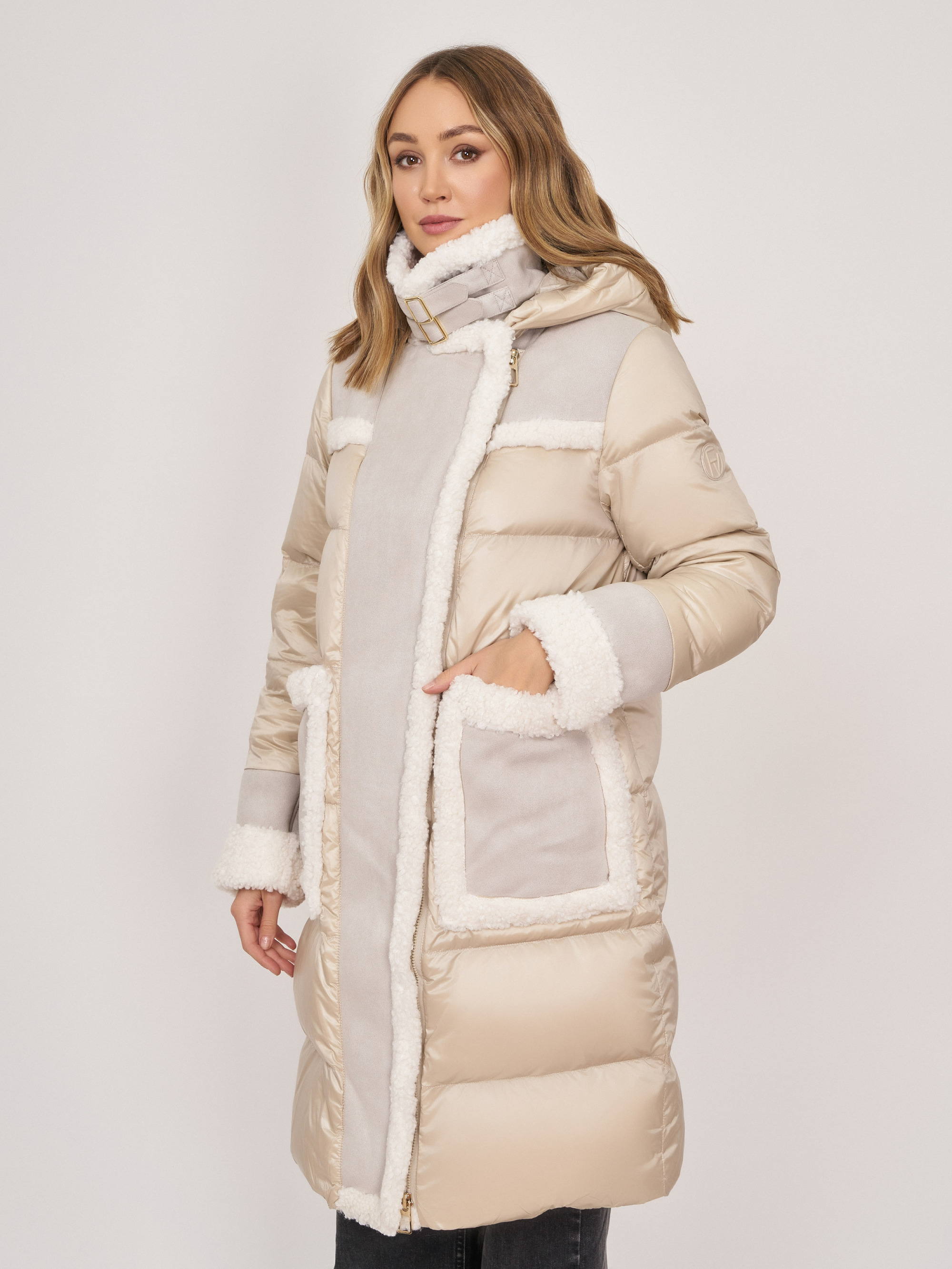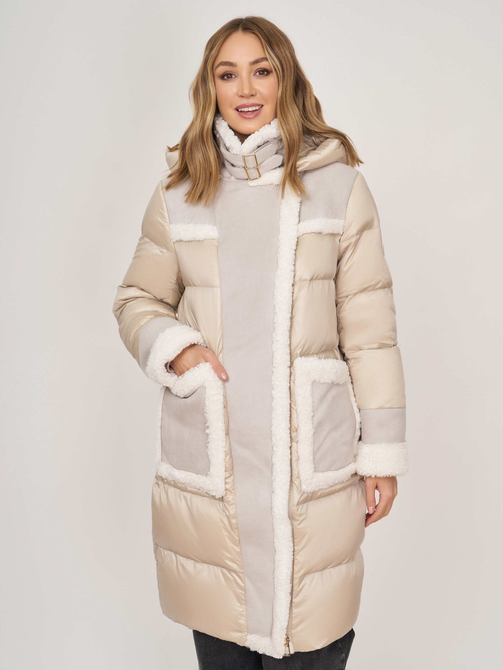 На сайте указаны российские размеры. Прямое утепленное светло-бежевое пальто на молнии, с воротником-стойка, со съемным капюшоном, с длинным рукавом, с накладными карманами. Дизайн дополнен серой замшей и белым искусственным мехом. Длина по спинке: 97 см. Рост модели: 175 см.