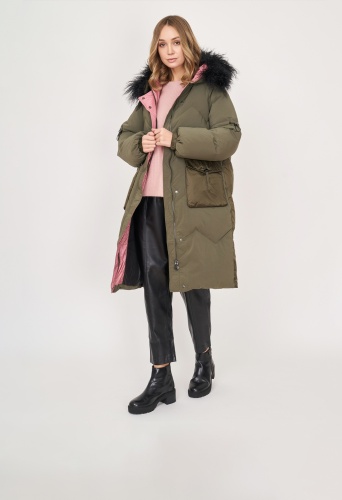 На сайте указаны российские размеры. Прямое утепленное хаки пальто на молнии и кнопках, с несъемным капюшоном, со съемной опушкой, с длинным рукавом с кулиской, с накладными карманами. Длина по спинке: 99 см. Рост модели: 175 см.