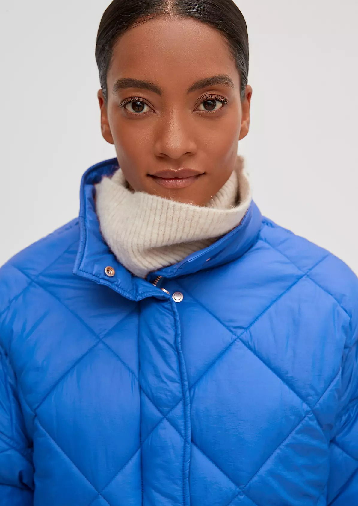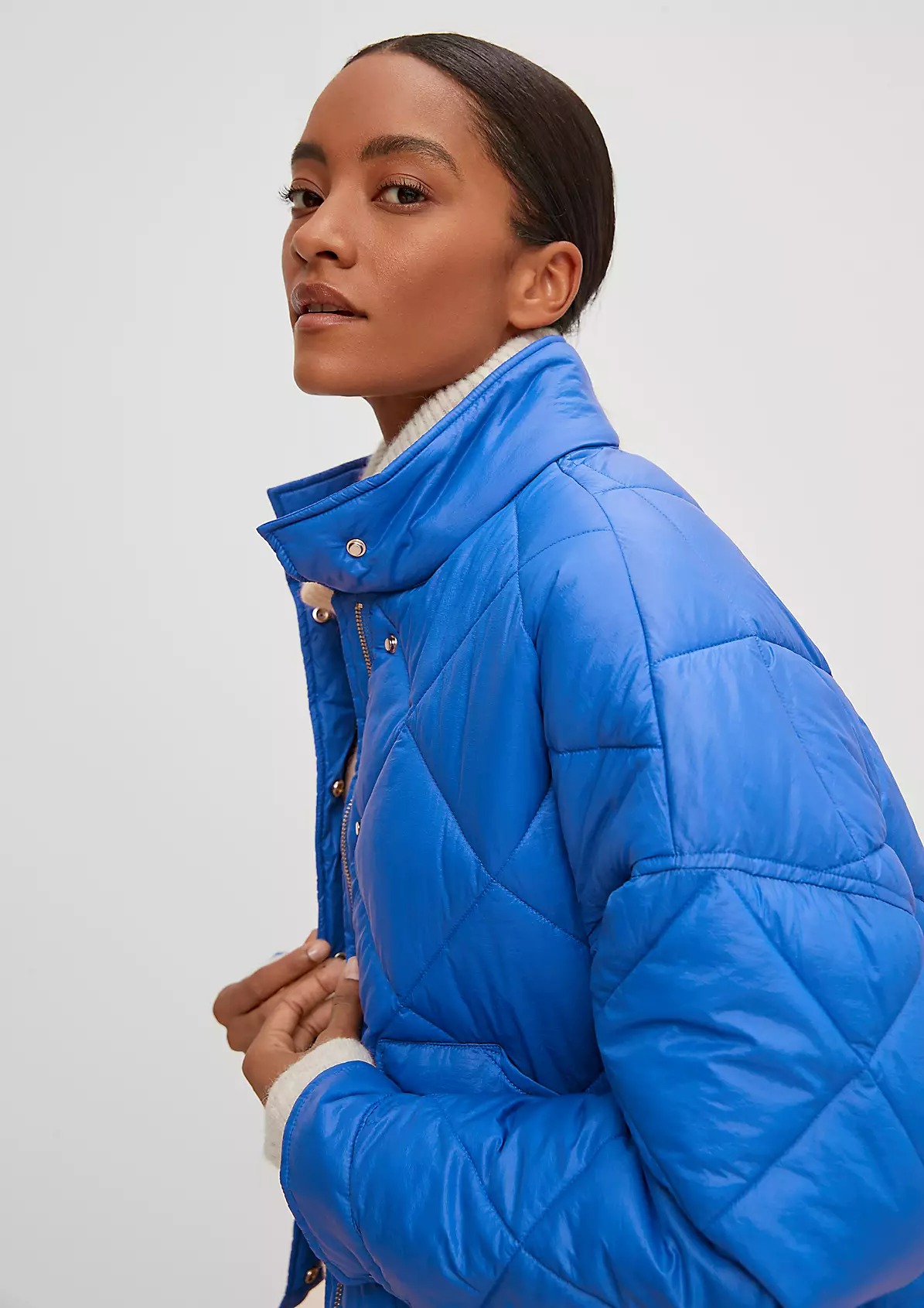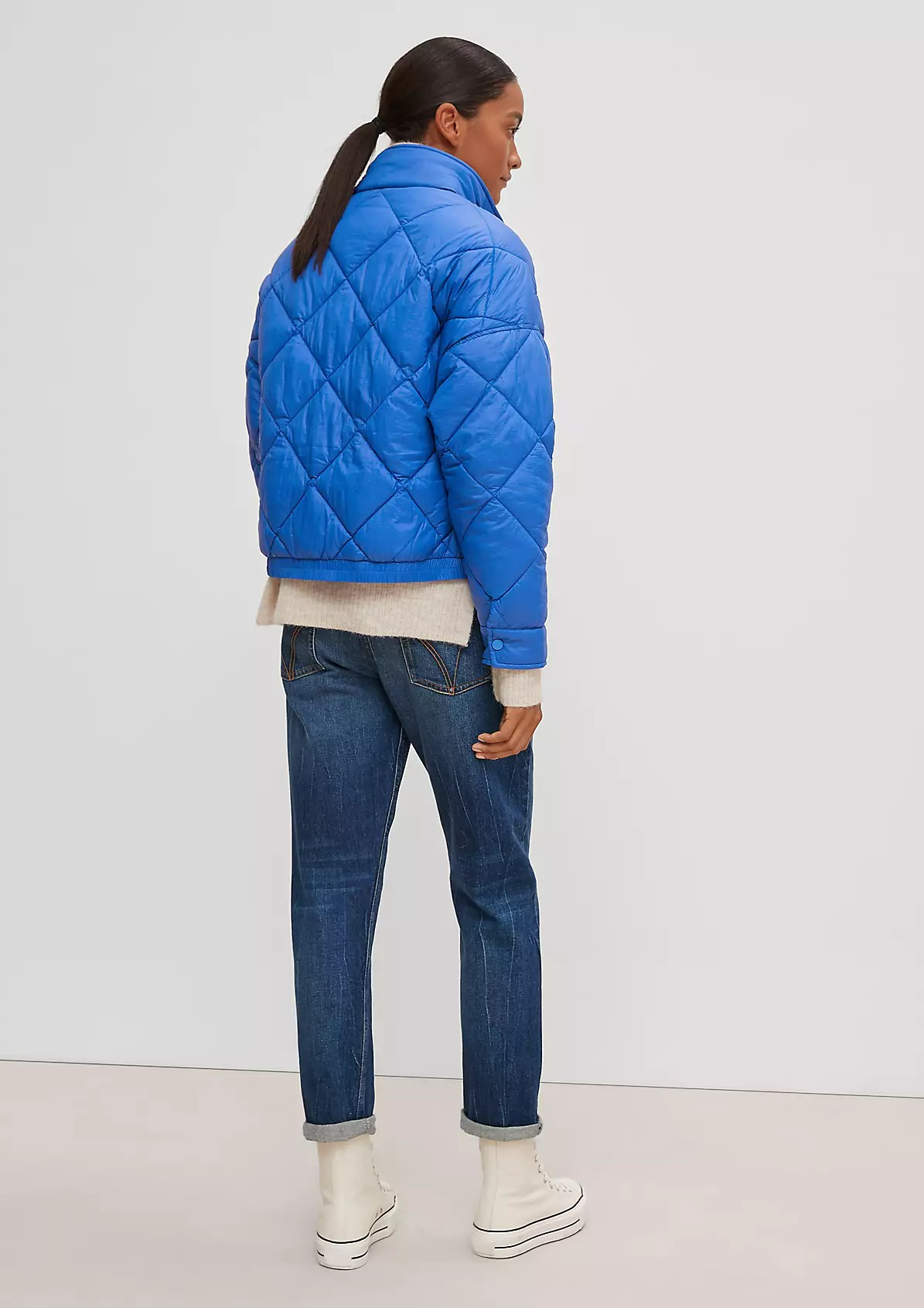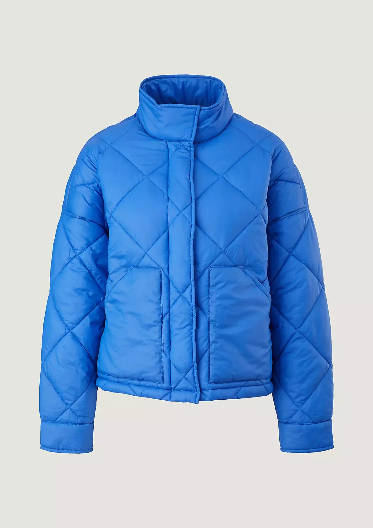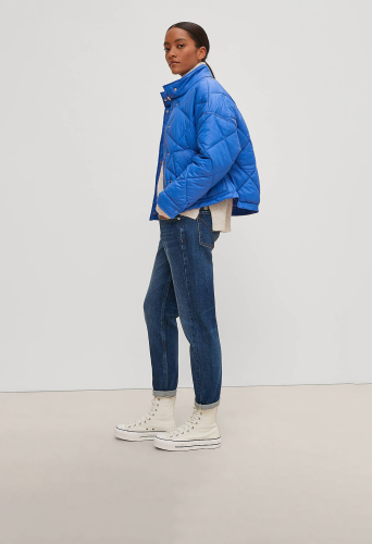 На сайте указаны российские размеры. Утепленная стеганая куртка с потайной молнией. Воротник-стойка. Рукава «летучая мышь», длинные рукава, манжеты. Накладной карман. Длина спины: 57 см в размере 42.
