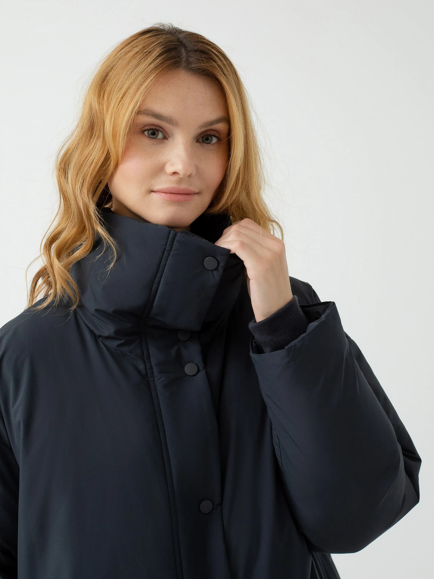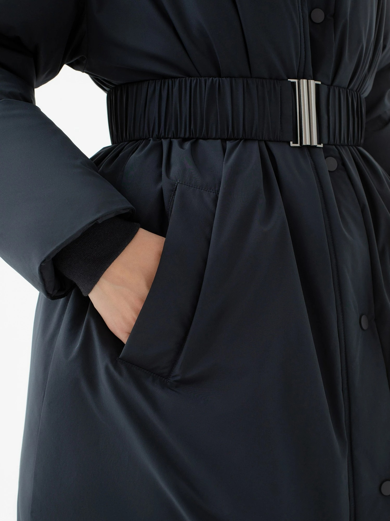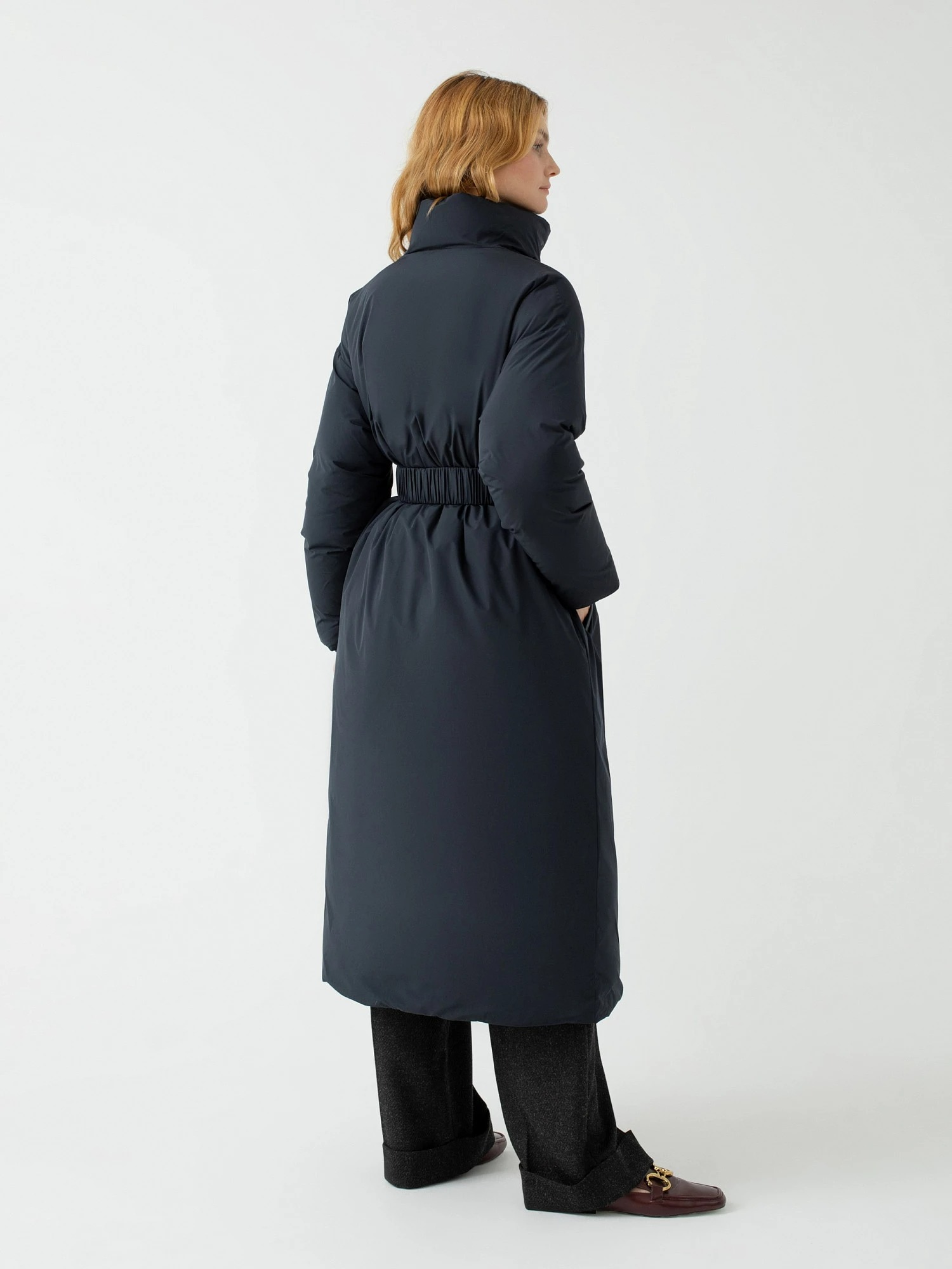 На сайте указаны российские размеры. Утепленное пальто прямого силуэта из плащевой ткани темно-синего цвета. Пальто произведено из премиальной плащевой ткани. В качестве утеплителя 90% пух и 10% перо. Комфортный рубашечный рукав, высокий воротник-стойка, что позволяет не использовать дополнительные теплые аксессуары, и при этом надежно сохраняет тепло. По низу рукава вязаная манжета в цвет основной ткани для дополнительного тепла. Длина пальто миди. Застежка на молнию и ряд потайных кнопок. В качестве дополнительного декора пояс-резинка на стильную металлическую пряжку, который дает возможность подчеркнуть силуэт. Внутренняя сторона пальто со стильной стежкой, которая переходит на лицевую сторону. Рост модели на фото - 175 см. Длина изделия - 123 см.