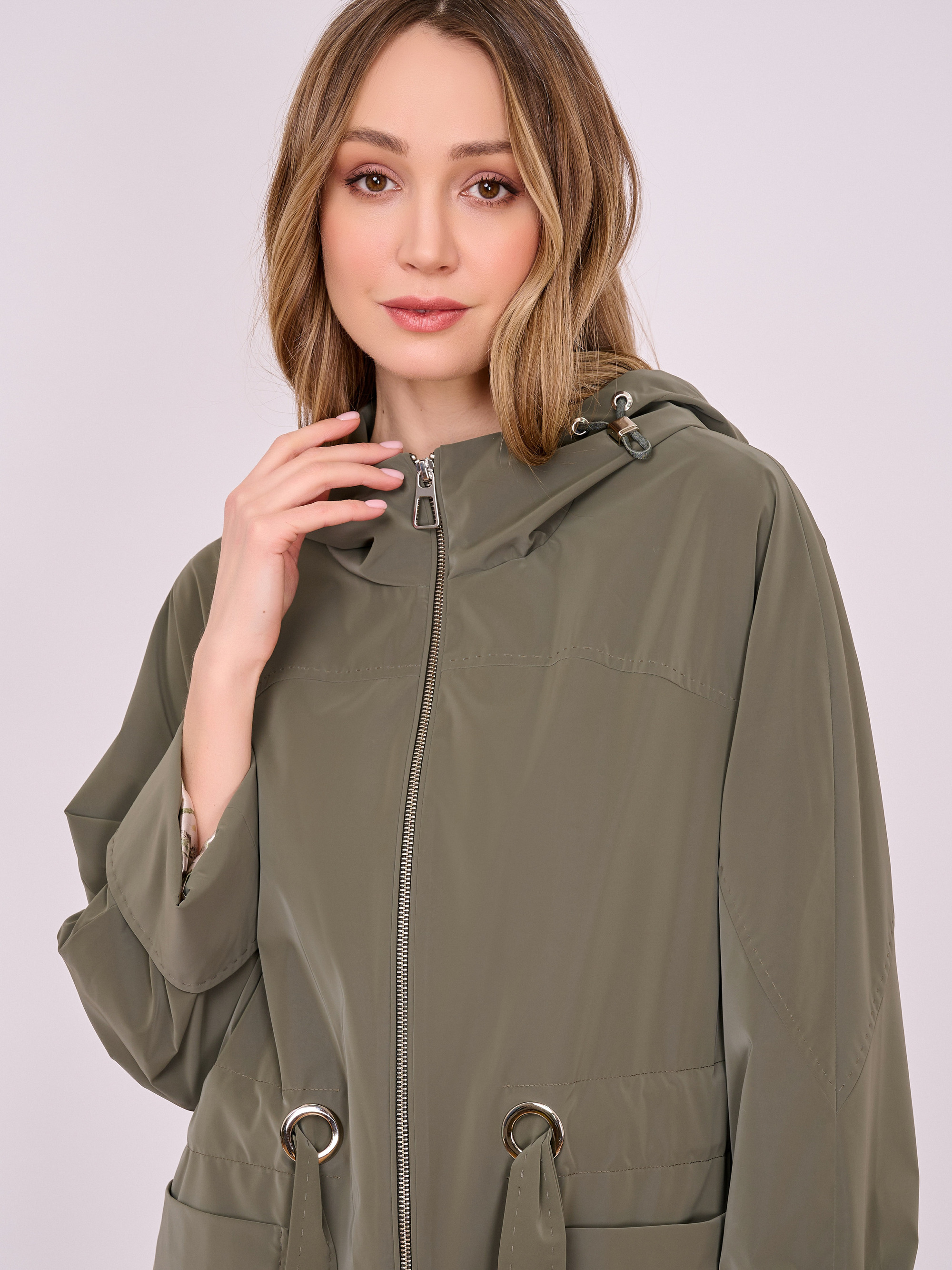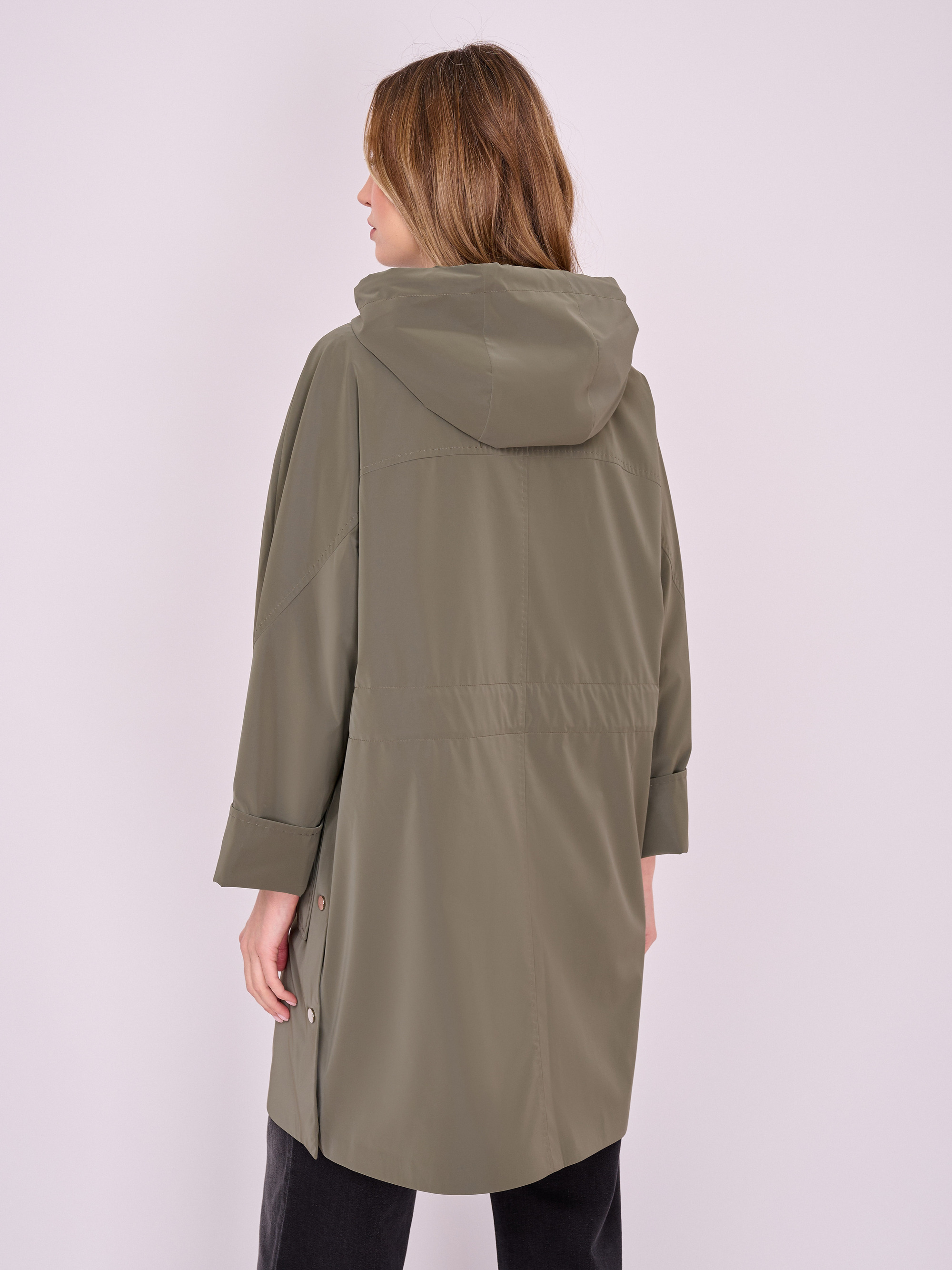 На сайте указаны российские размеры. Укороченный прямой плащ на молнии с капюшоном, длинными рукавами с отворотами, накладными карманами и кулиской по линии талии. Боковые разрезы застегиваются на кнопки. Длина по спинке: 90 см. Рост модели: 175 см.