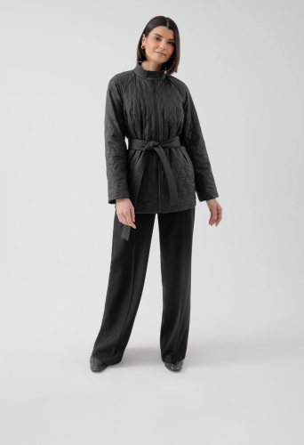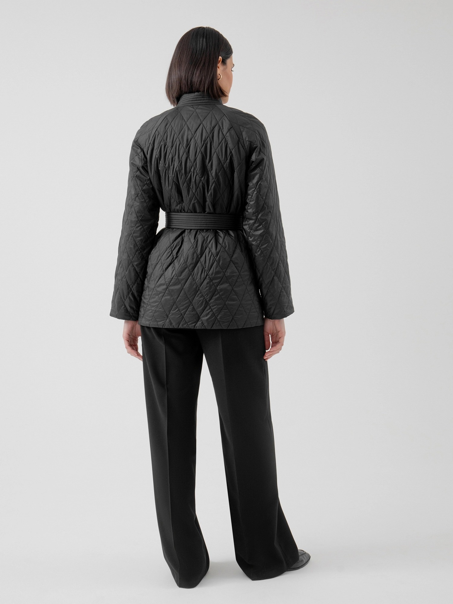На сайте указаны российские размеры. Укороченная куртка из стеганой плащевой ткани в глубоком черном цвете. Куртка имеет высокий и комфортный воротник-стойку, надежную застежку на тракторную молнию и пояс из основной ткани в комплекте, который позволяет сделать силуэт еще более женственным и подчеркнуть талию. Длина изделия: 72 см. Рост модели 175 см.