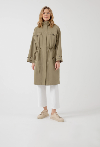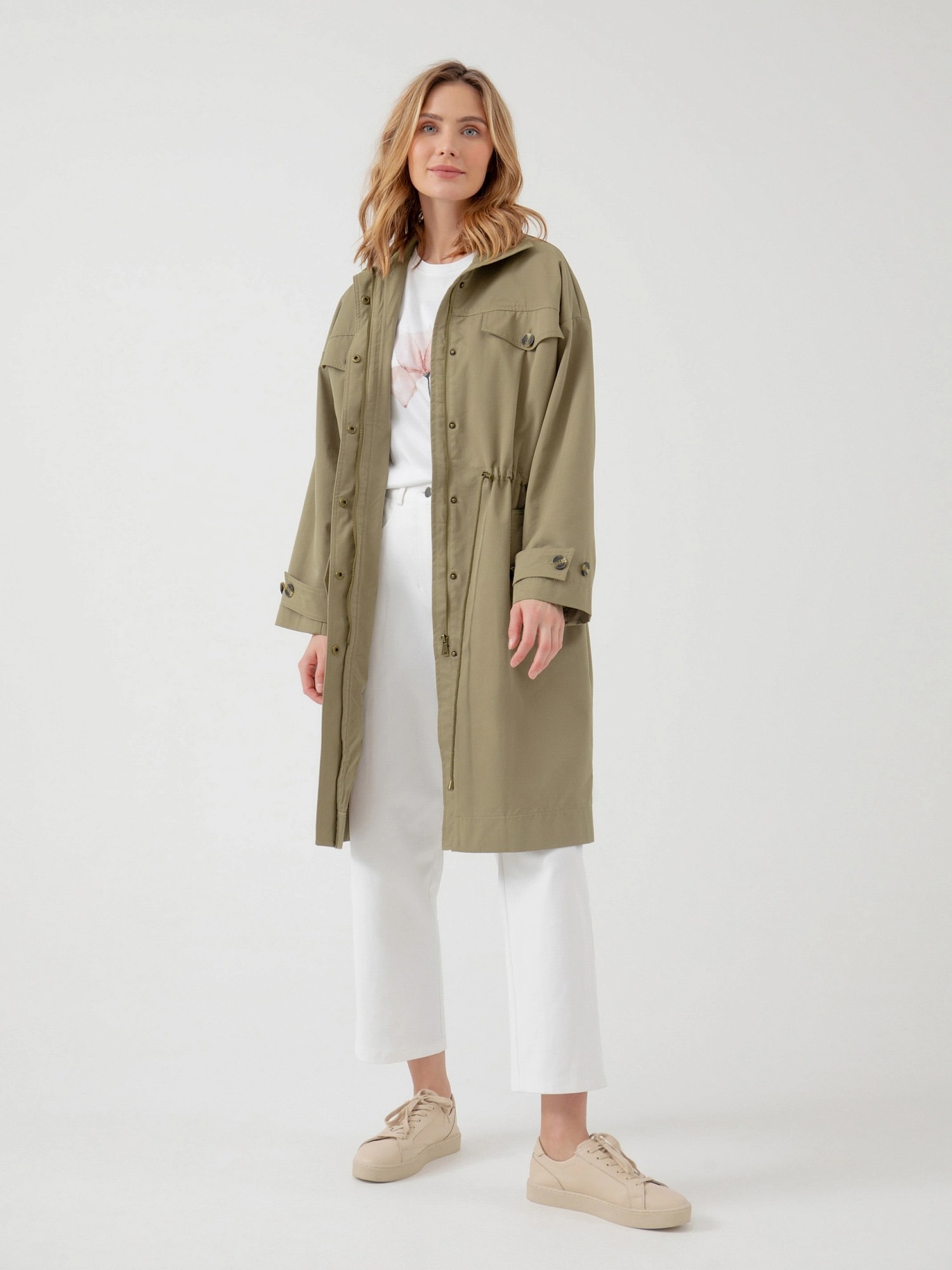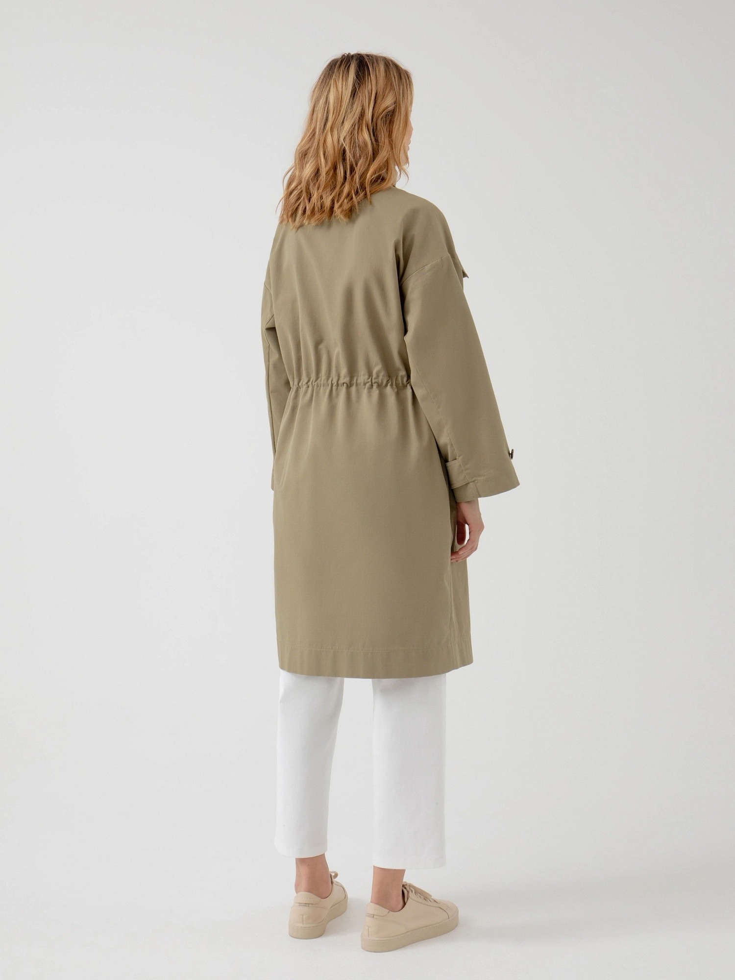 На сайте указаны российские размеры. Плащ прямого силуэта из премиальной плащевой ткани в цвете "серебряный шалфей". Плащ имеет кофмортный воротник-стойку, который не только очень стильно выглядит, но и защищает от сильного ветра. В области талии плащ имеет кулиску со шнуром, который с легкостью регулирует посадку и делает силуэт как более прилегающим, так и свободным. Тренч имеет четыре кармана с клапанами, которые не только очень функциональные, но и служат дополнительным декором. Спущенный рубашечный рукав очень комфортный и дает возможность с легкостью надевать первым слоем более объемные вещи, не стесняя при этом движений. Длина изделия: 111 см. Рост модели 175 см.