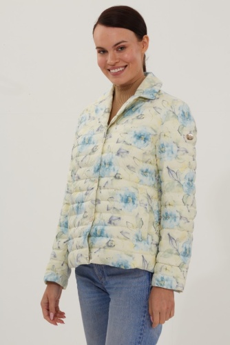 Куртка женская укороченная на синтетическом пуху. Выполнена из принтованной водоотталкивающей ткани. Застежка по борту на кнопках, карман листочка.
