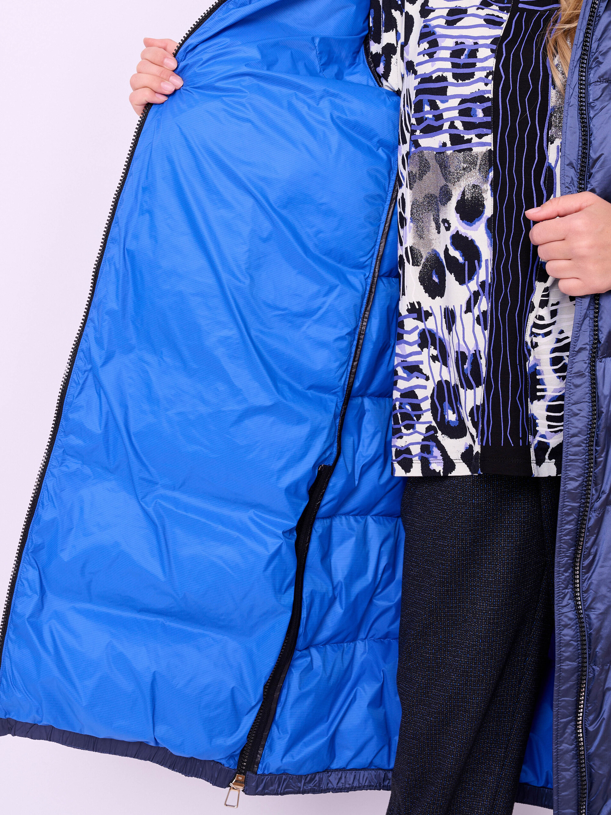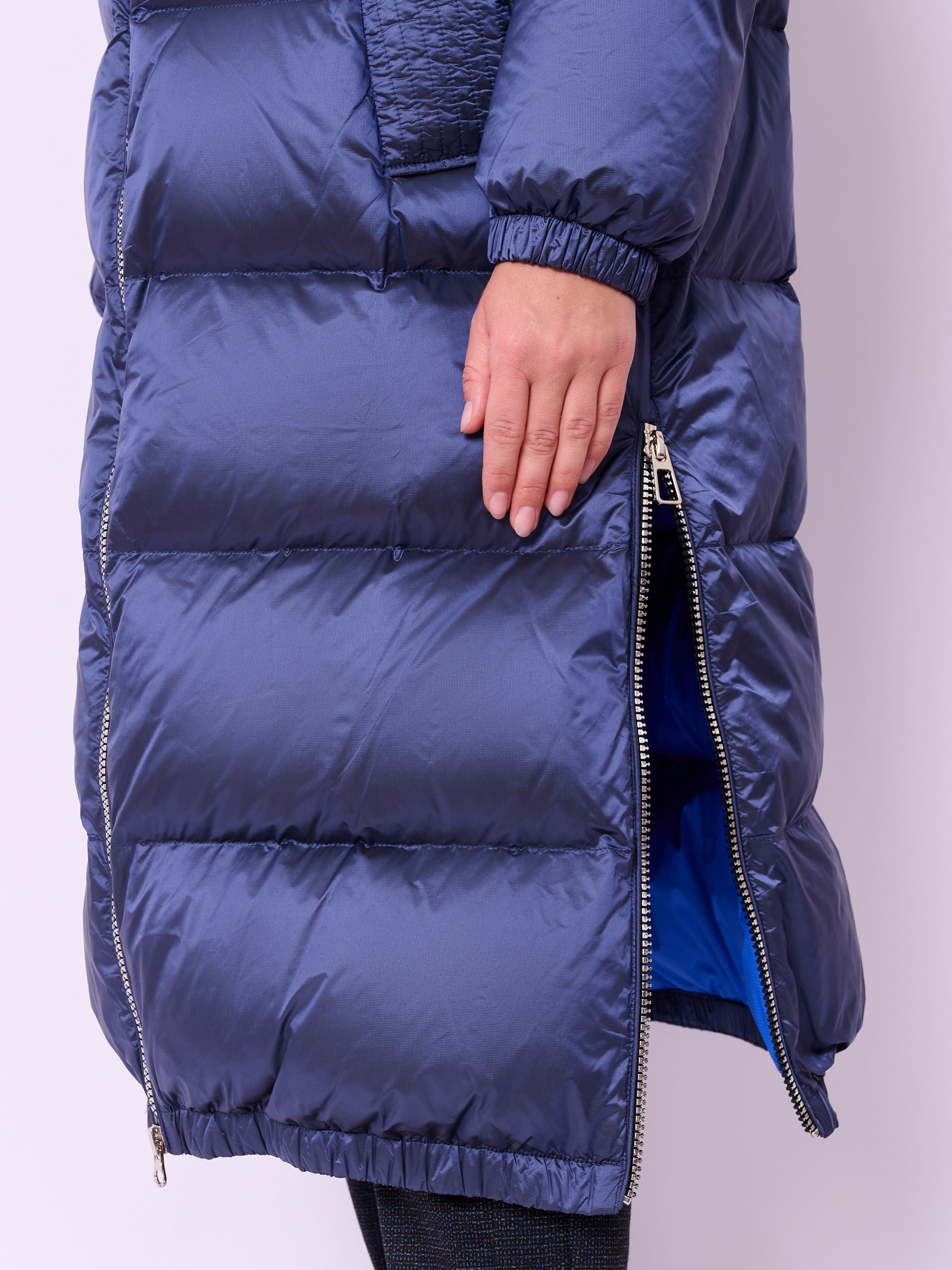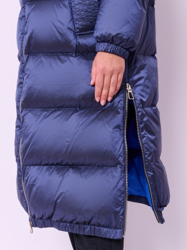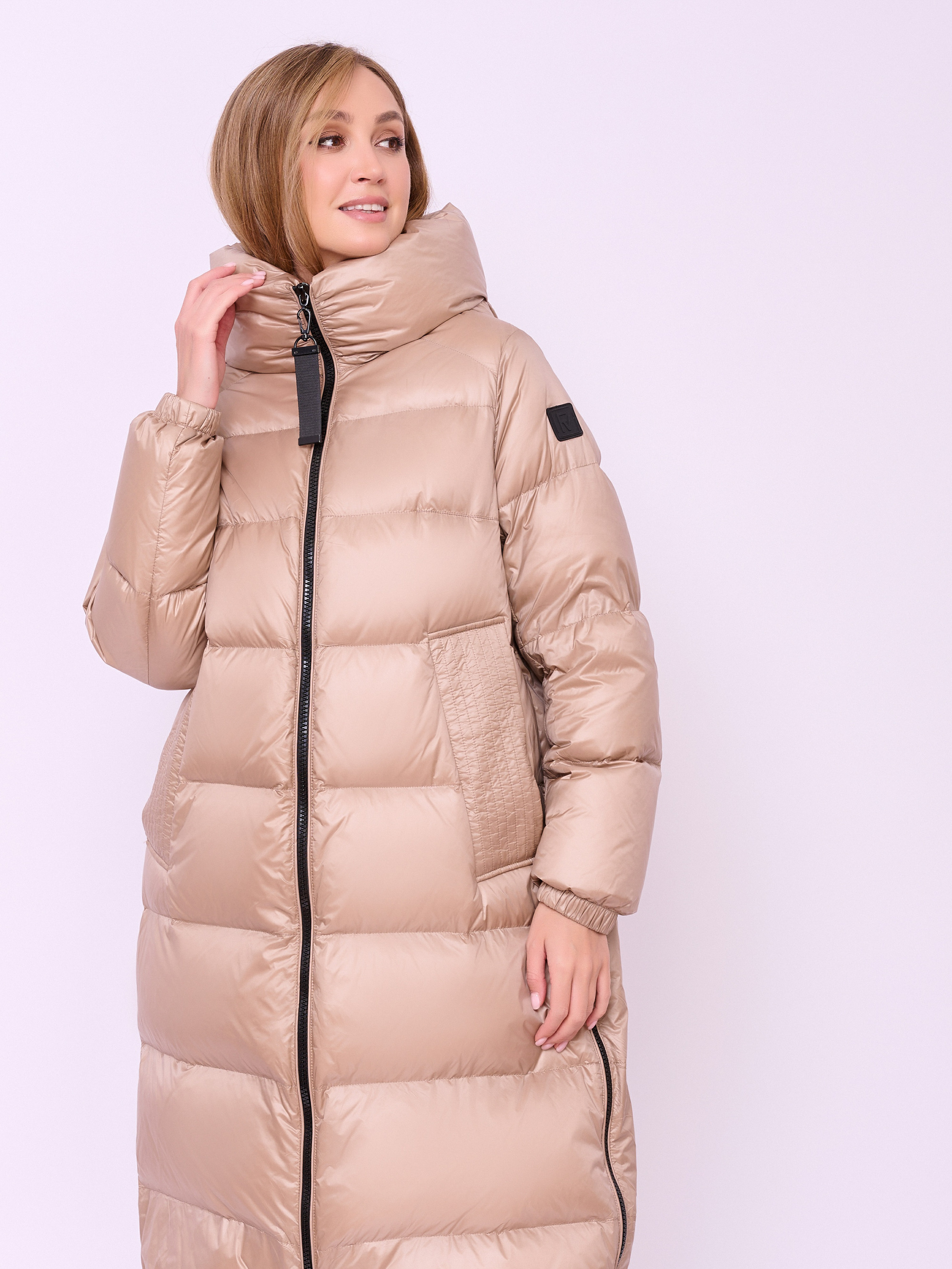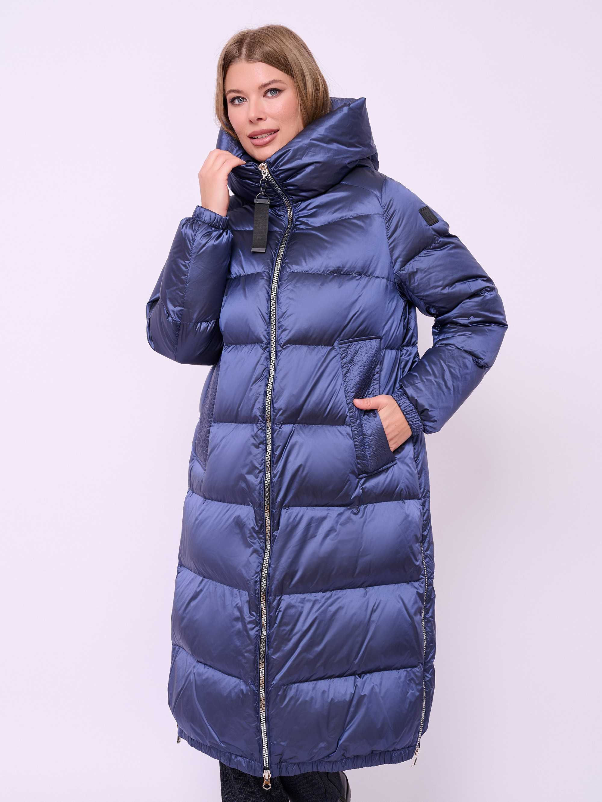 Пальто-пуховик стеганое с высоким воротом, несъемным капюшоном на кулиске без опушки, с длинными рукавами на резинке, прорезными карманами на магнитной кнопке, высокими разрезами на молнии и низом на резинке. Длина по спине: 112 см