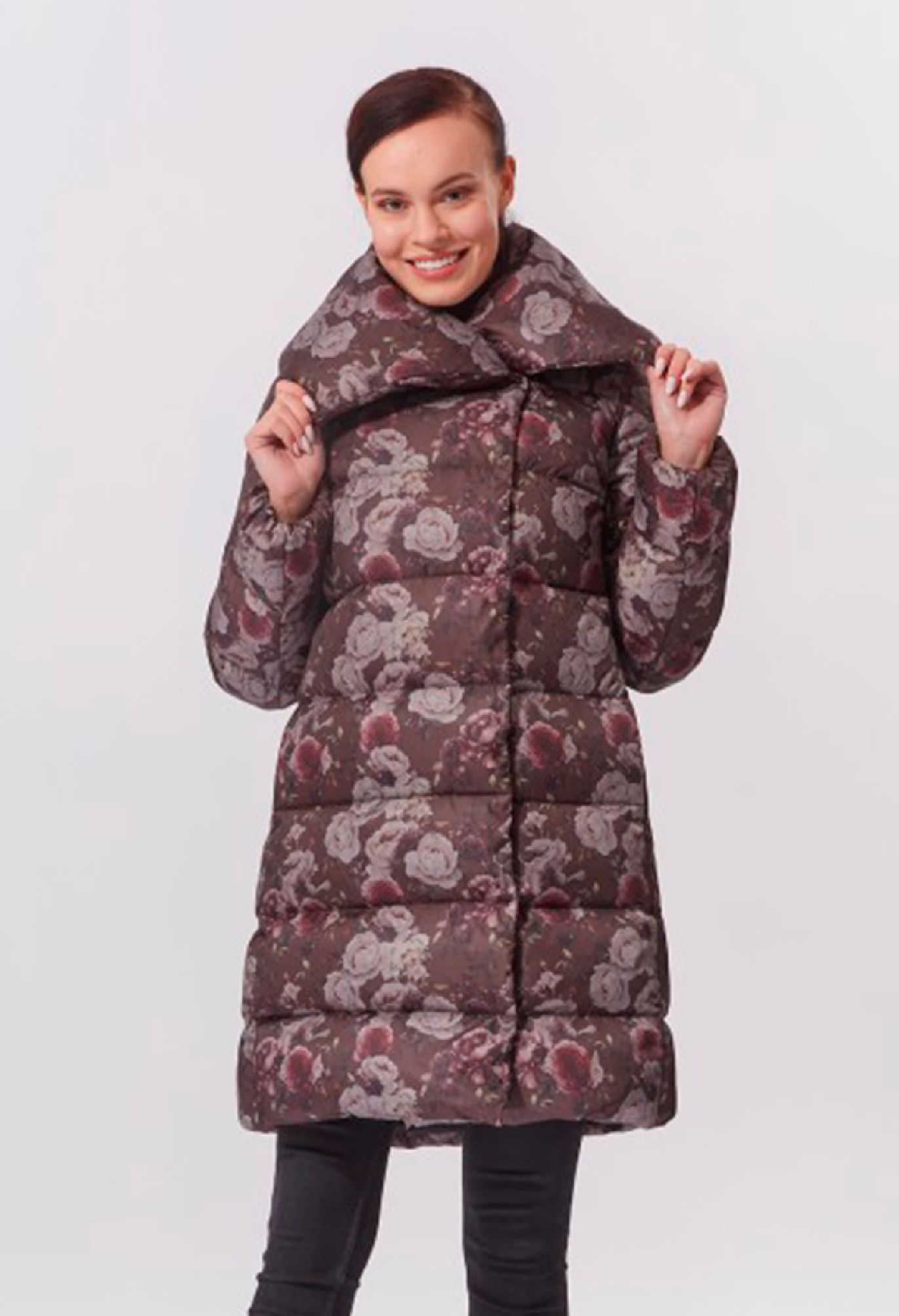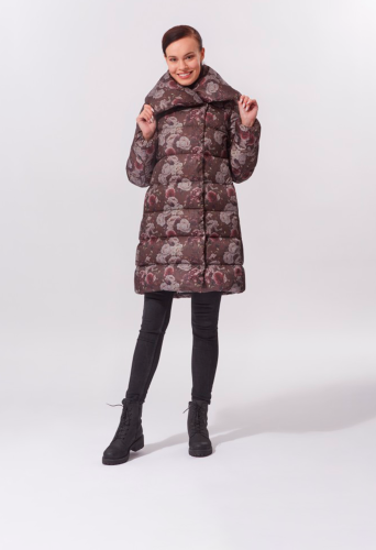 Легкое полупальто из принта на натуральном пуху. Воротник- полукапюшон half hood, застежка молния и кнопки, рукав внутри по низу на резинке. Силуэт слегка расклешенный. Карманы по бокам на молнии.