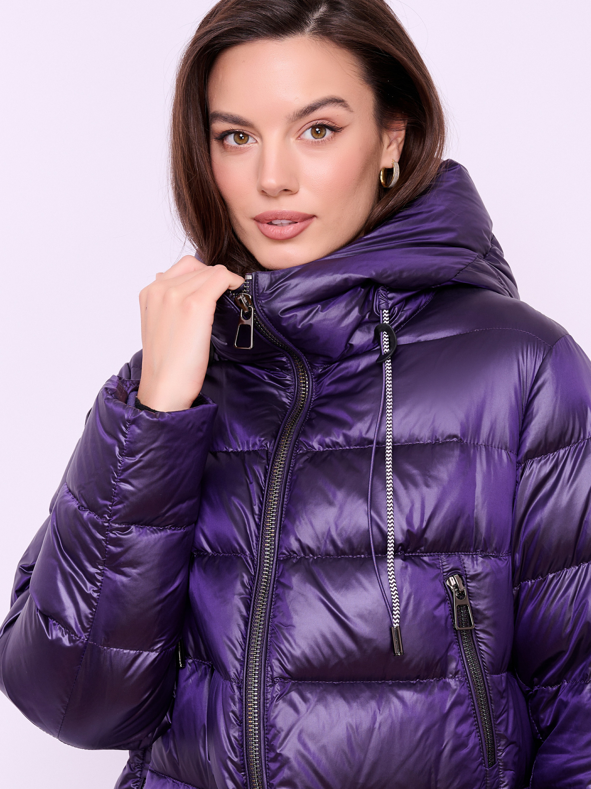 Пальто-пуховик стеганое с высоким воротом, несъемным капюшоном на кулиске, без опушки, с длинными рукавами-реглан с трикотажными манжетами, прорезными карманами на молнии и длинными разрезами на молнии. Длина по спине: 111 см.