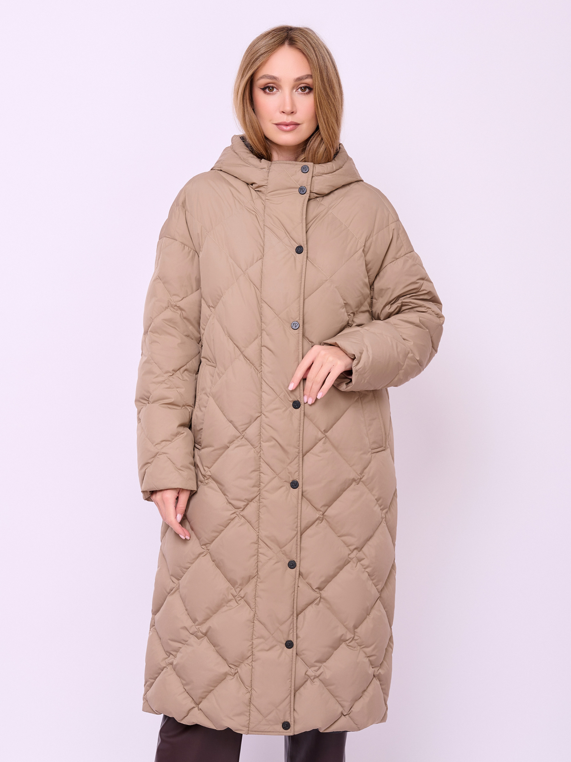 Пальто утепленное стеганое на молнии и кнопках с несъемным капюшоном на кулиске, без опушки, с длинными рукавами с трикотажными манжетами, прорезными карманами. Длина по спине: 112 см.