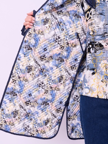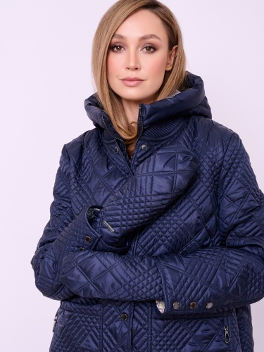 Утепленное стеганое пальто прямого покроя средней длины с воротником-стойкой, съемным капюшоном-манишкой, длинными рукавами на кнопках, накладынми карманами и рукавицами из основного материала. Длина по спинке: 92 см