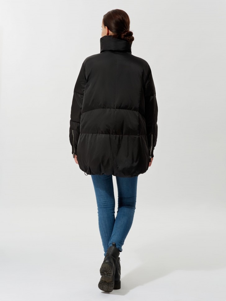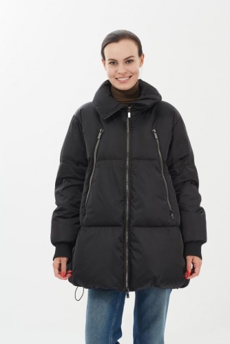 Куртка женская силуэта трапеция, выполнена из водоотталкивающей ткани с использовании матового сатинового покрытия. Застежка борта и карманы на молнии. На рукавах разрезы на молниях и по краю резинка. Высокий объемный воротник. По низу изделия кулиска.