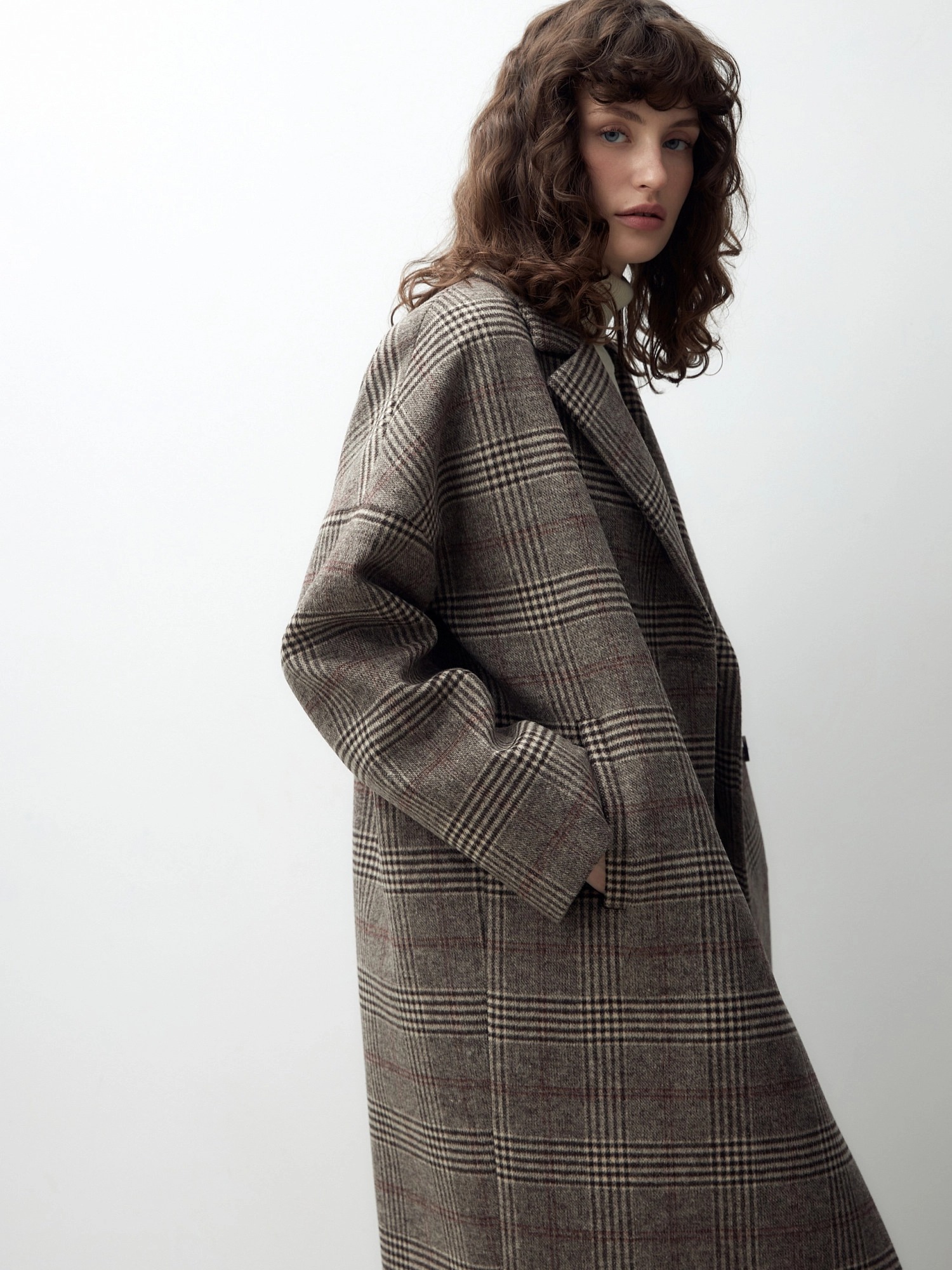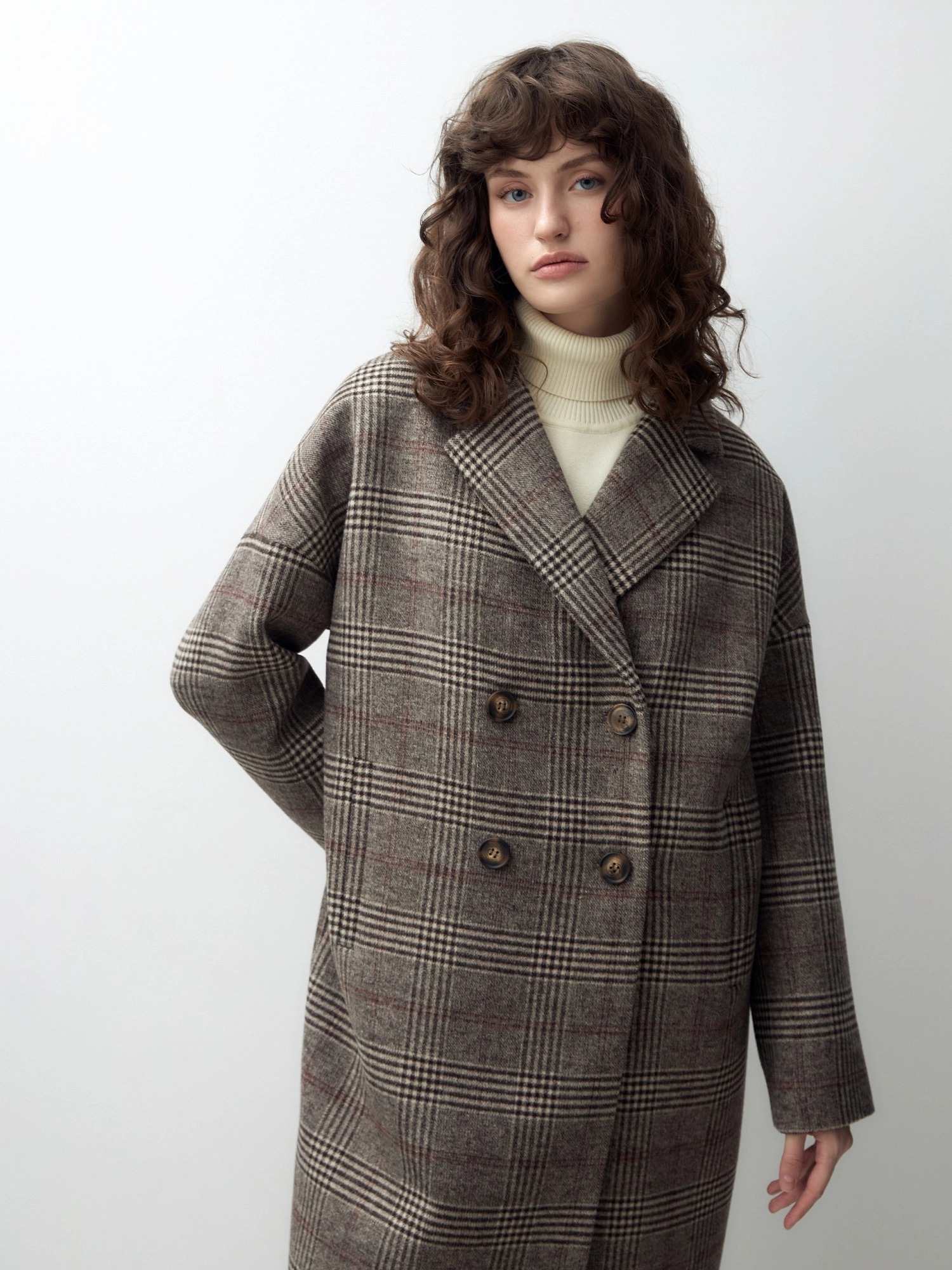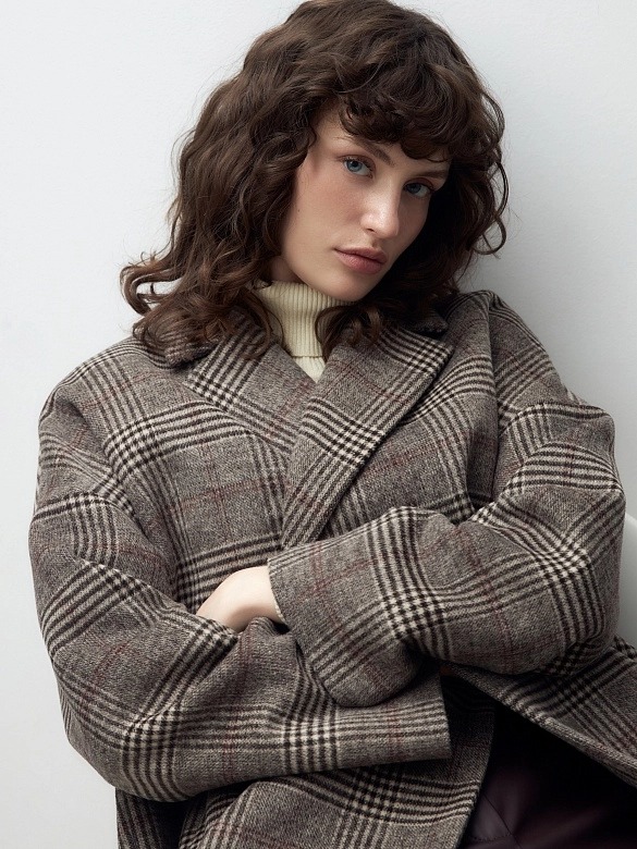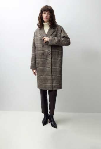 Двубортное пальто с характерным силуэтом "удлиненный кокон" - универсальная вещь для любого гардероба. Комфортный рубашечный рукав со спущенным плечом не стесняет движений. Пальто имеет классический английский воротник, по бокам расположены два глубоких функциональных кармана с зауженными листочками. Пальто модной длины до колена с застежкой на два ряда крупных пуговиц с мягким велюровым покрытием. Спинка имеет дополнительное утепление. Пальто выполнено из пальтовой шерстяной ткани коричневого цвета с модным принтом в клетку.