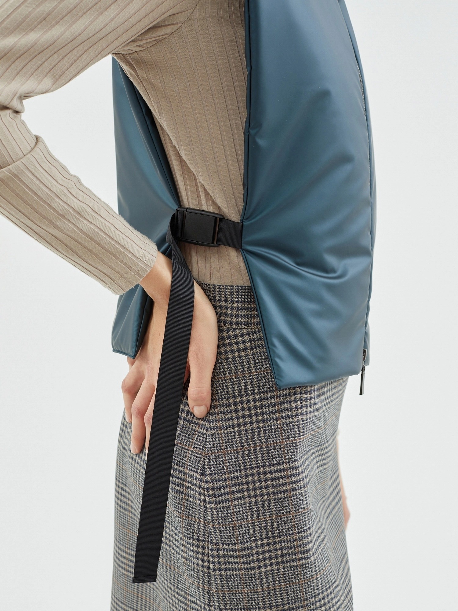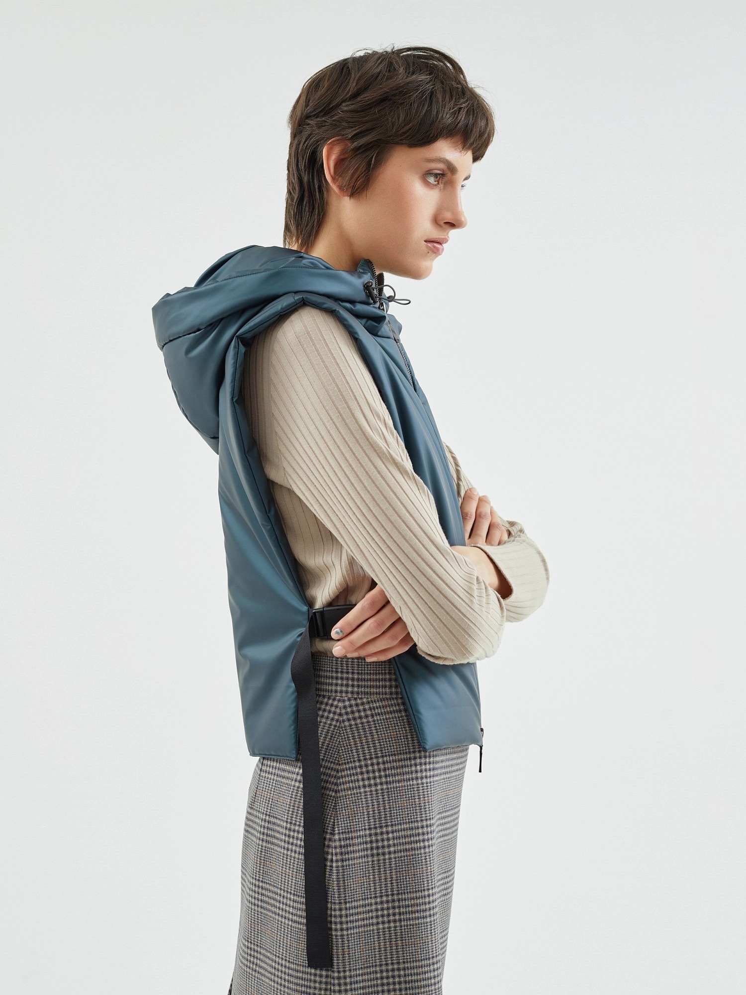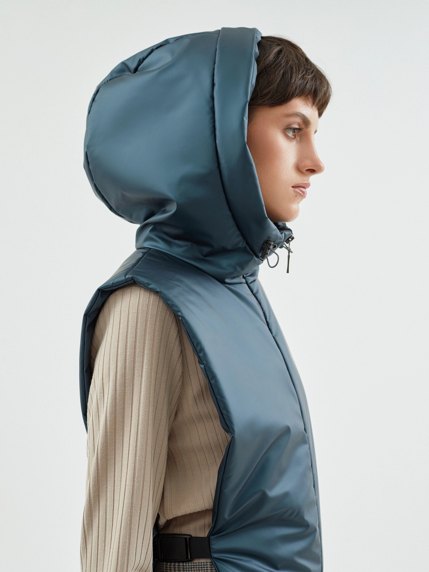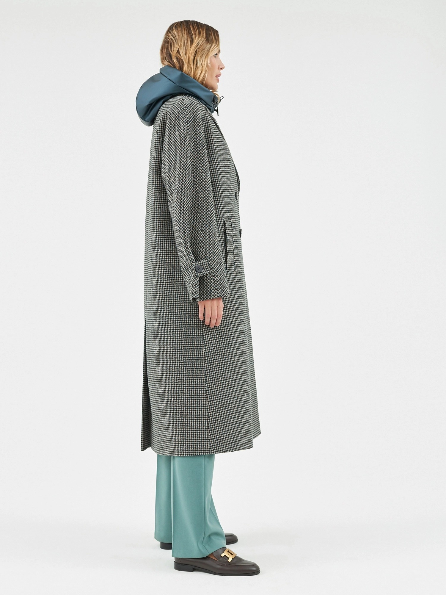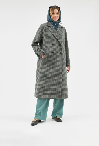 Объемное пальто прямого силуэта из шерстяной ткани в черно-изумрудном оттенке с принтом пье-де-пуль. Классический английский воротник приобретает новую современную форму и стремится к застежке пальто, что зрительно вытягивает силуэт. Пальто имеет мягкую линию рукава-кимоно, по низу которого рсположена встречная складка с фиксацией на пату для регулировки объема рукава. Длина пальто ниже колена, в среднем шве спинки располагается высокая шлица. Застегивается изделие на ряд крупных темных стильных пуговиц. В качестве нового модного декоративного и функционального элемента к пальто прилагается съемный капюшон с удлиненной манишкой в изумрудном оттенке из плащевой ткани с водонепроницаемым покрытием. Такой капюшон также можно использовать отдельно, как самостоятельное изделие. Манишка капюшона очень длиная, что может заменить полноценный жилет, а на талии располагаются застежки-фастексы, надежно фиксирующие изделие.