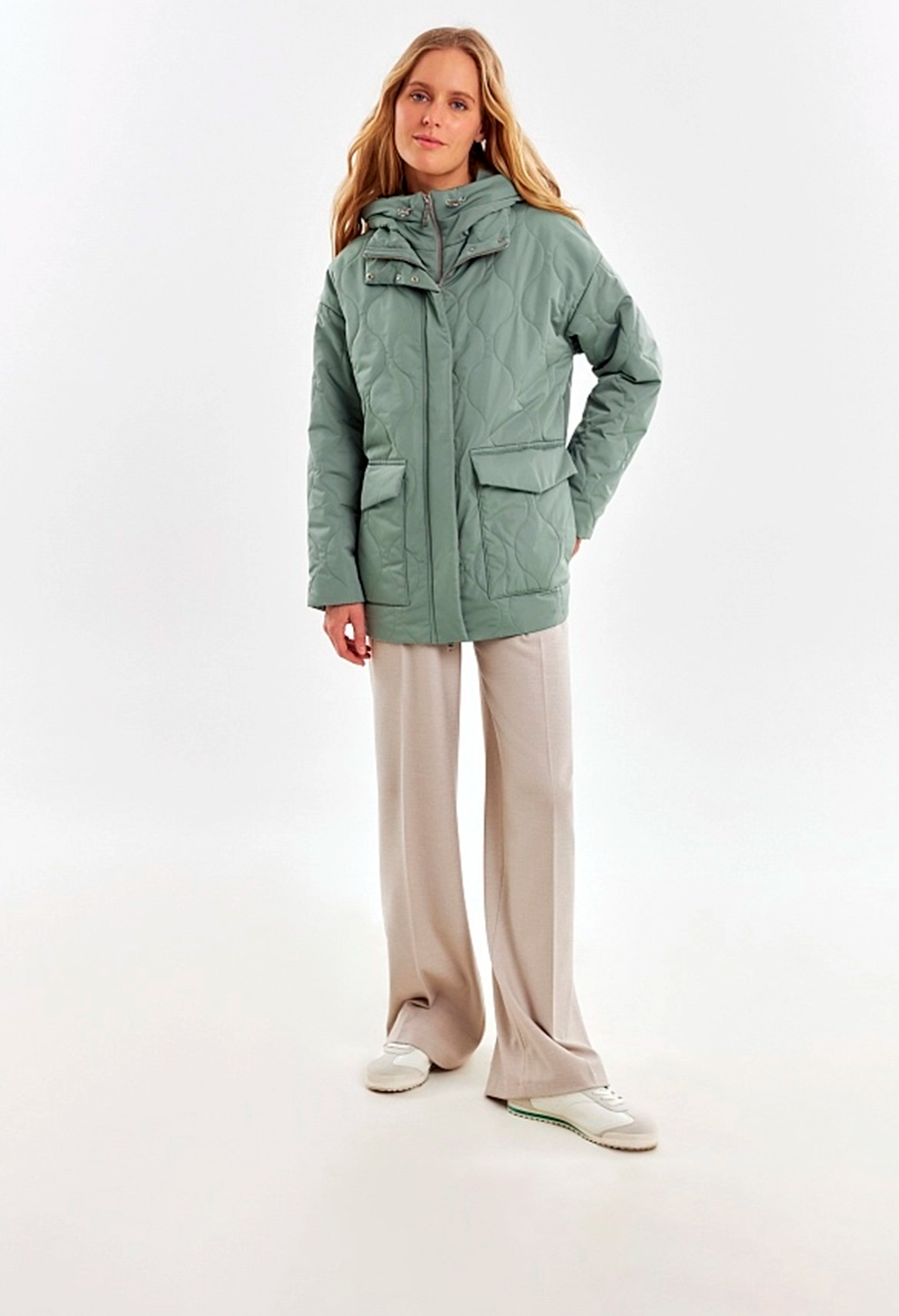 Короткая весенняя куртка из стеганой плащевой ткани в ультрамодном цвете "зеленый айсберг". Куртка имеет прямой силуэт, комфортный рубашечный рукав и высокий воротник-стойку. По бокам располагаются глубокие накладные карманы с клапанами. Застегивается изделие на молнию и установочные кнопки. В комплекте с курткой предлагается съемный капюшон с короткой манишкой. Капюшон, а также карманы и планка куртки выполнены из плащевой ткани-компаньона в цвете основной.
