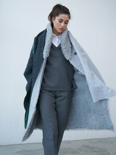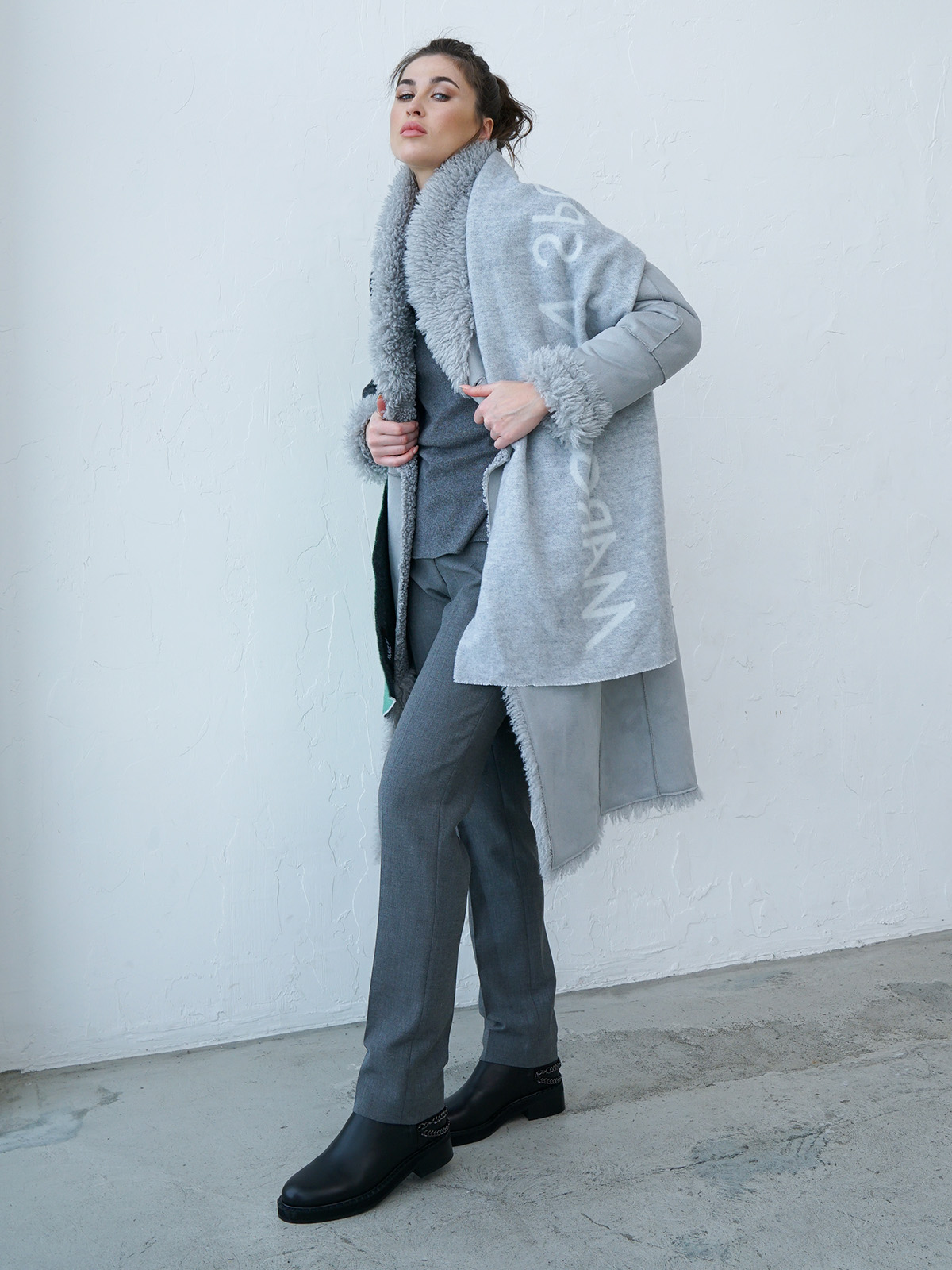 Экодубленка в базовом сером оттенке. Прямой силуэт, отделка имитирующая овчину. Застежка на контрастные пуговицы.