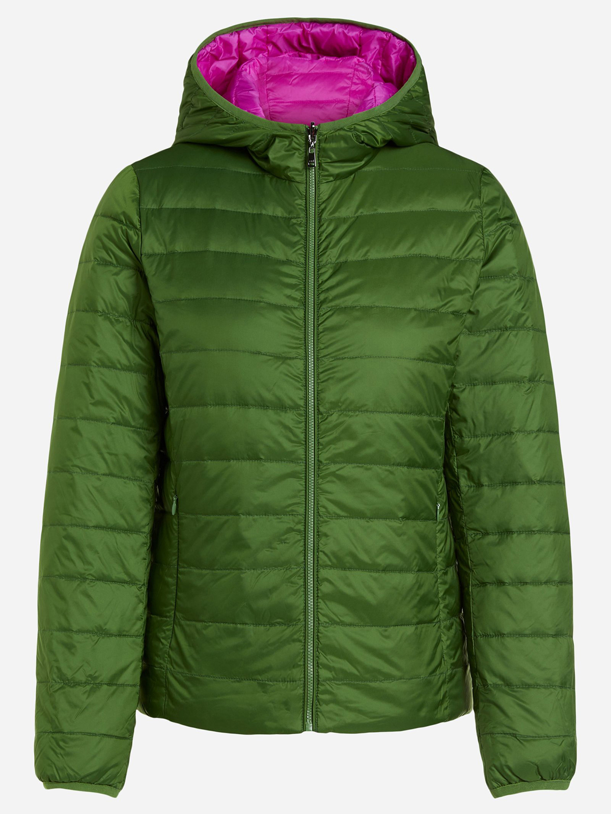Двусторонняя куртка в оригинальной расцветке, сочетание насыщенного зеленого и яркой фуксии. Вместительный капюшон, застежка на молнию. Практичные боковые карманы. Длина 60 см для размера 42. Рост модели 178 см, ее размер – 42 (российский).