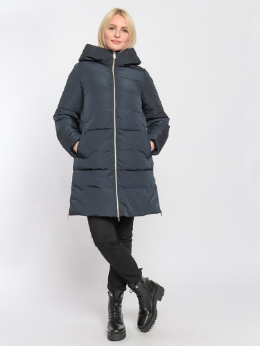 Темно-синее пальто с синтепоновым наполнителем – универсальная модель, хорошо сочетается с различными нарядами. Объемный капюшон, застежка на двойную молнию. Два боковых кармана с листочкой.