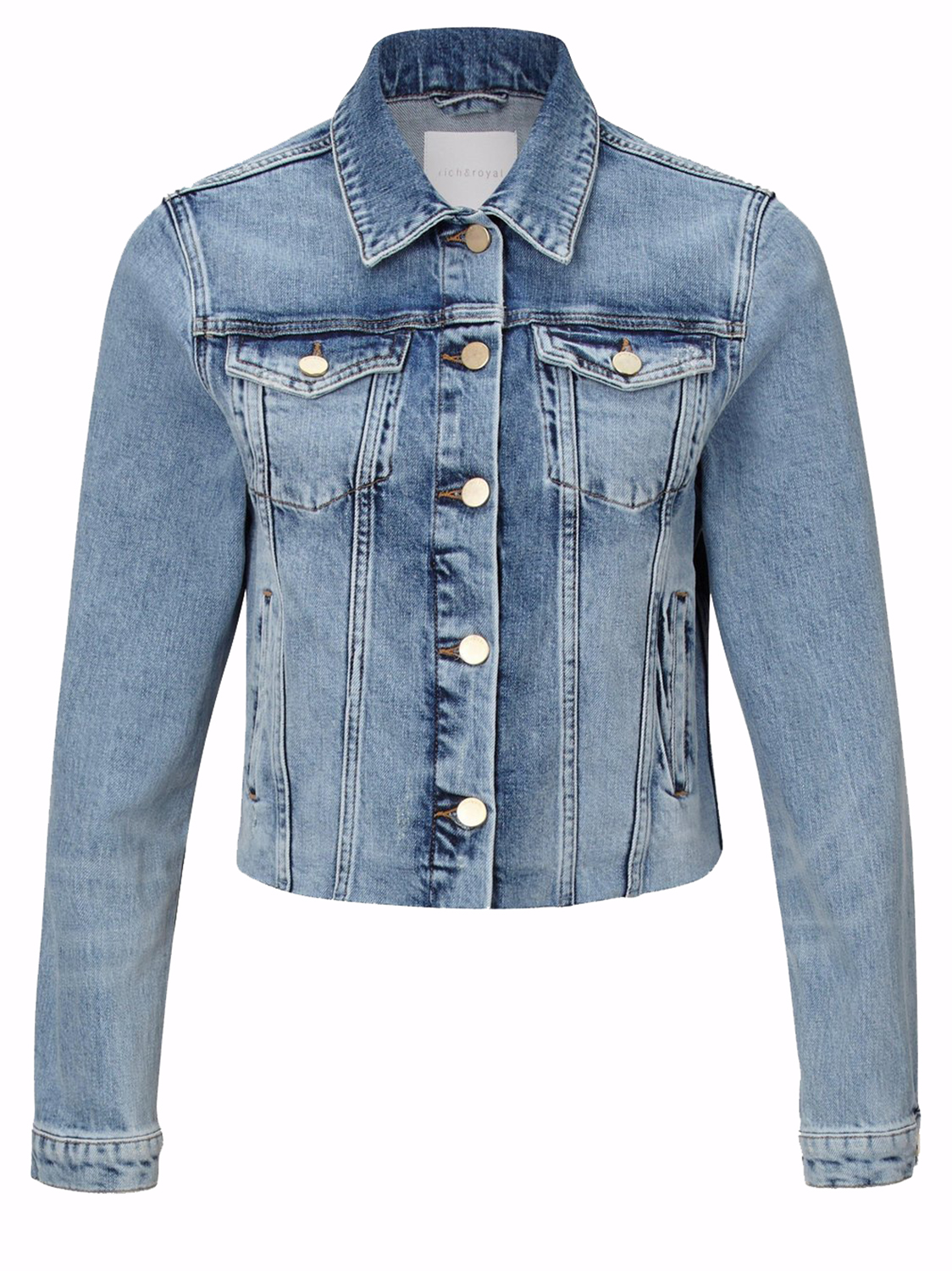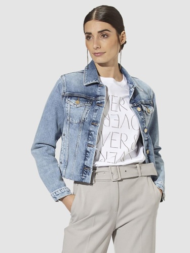 Укороченная джинсоая куртка с необработанным краем. Отложной рубашечный воротник, втачной рукав полной длины. Накладные карманы на груди, застежка на пуговицы.
