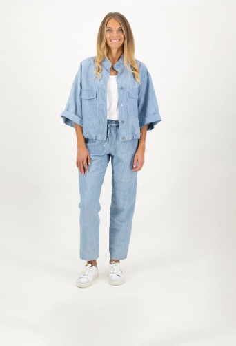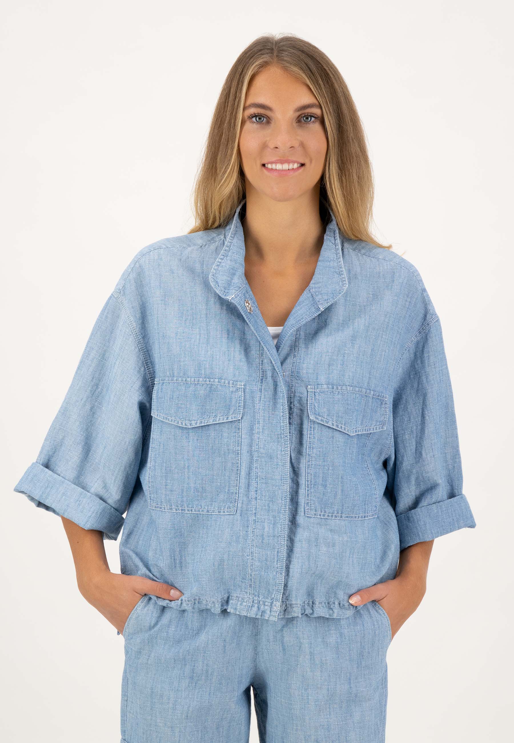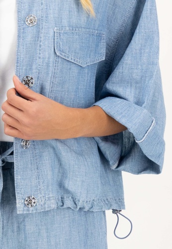 Повседневная куртка-рубашка с планкой на потайных пуговицах и карманами с клапанами.