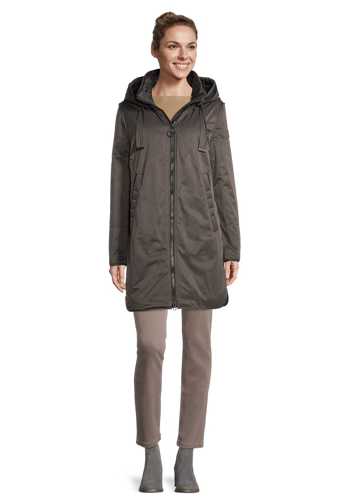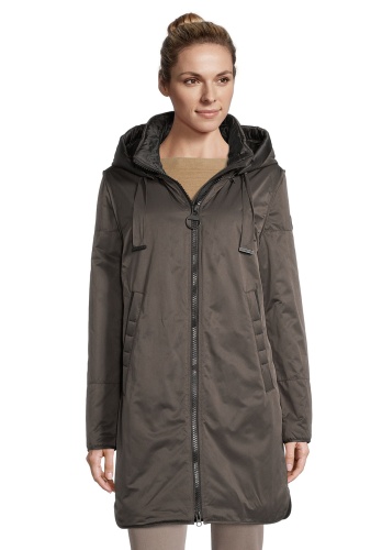 Пальто на облегченном синтепоне. Комфортная длина, капюшон на кулиске, практичный воротник-стойка, двойная застежка-молния, карманы с листочкой. Ткань верха обеспечивает защиту от ветра и влаги.