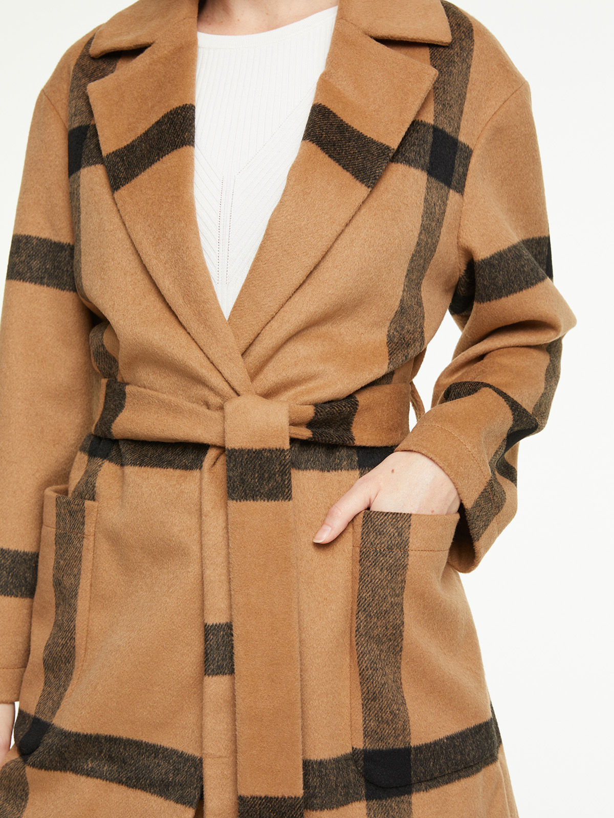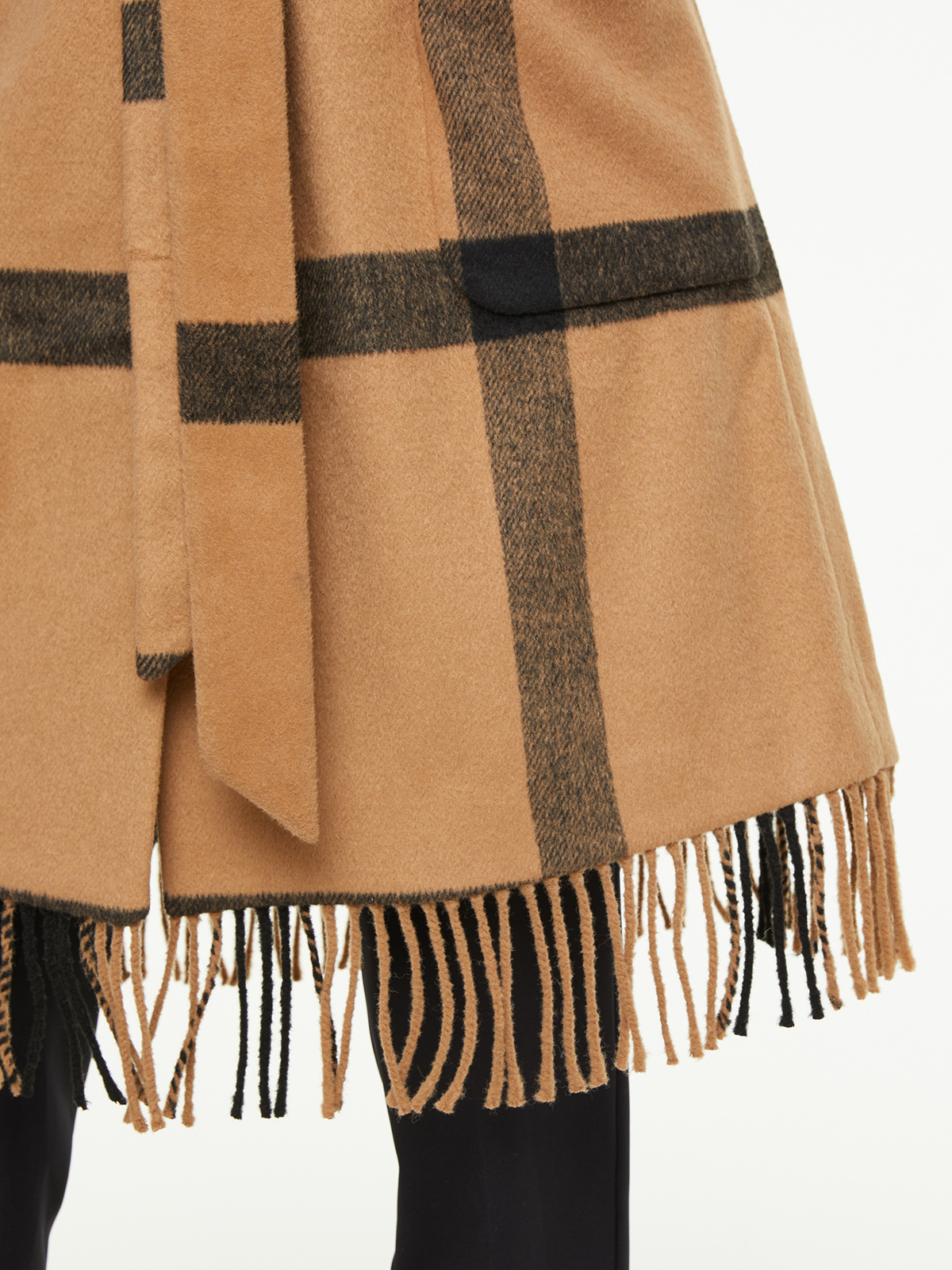 Пальто-халат в крупную клетку. Стильная деталь в виде бахромы по низу изделия. Отложной воротник с лацканами, длинный втачной рукав. В комплекте идет пояс из основного материала изделия.