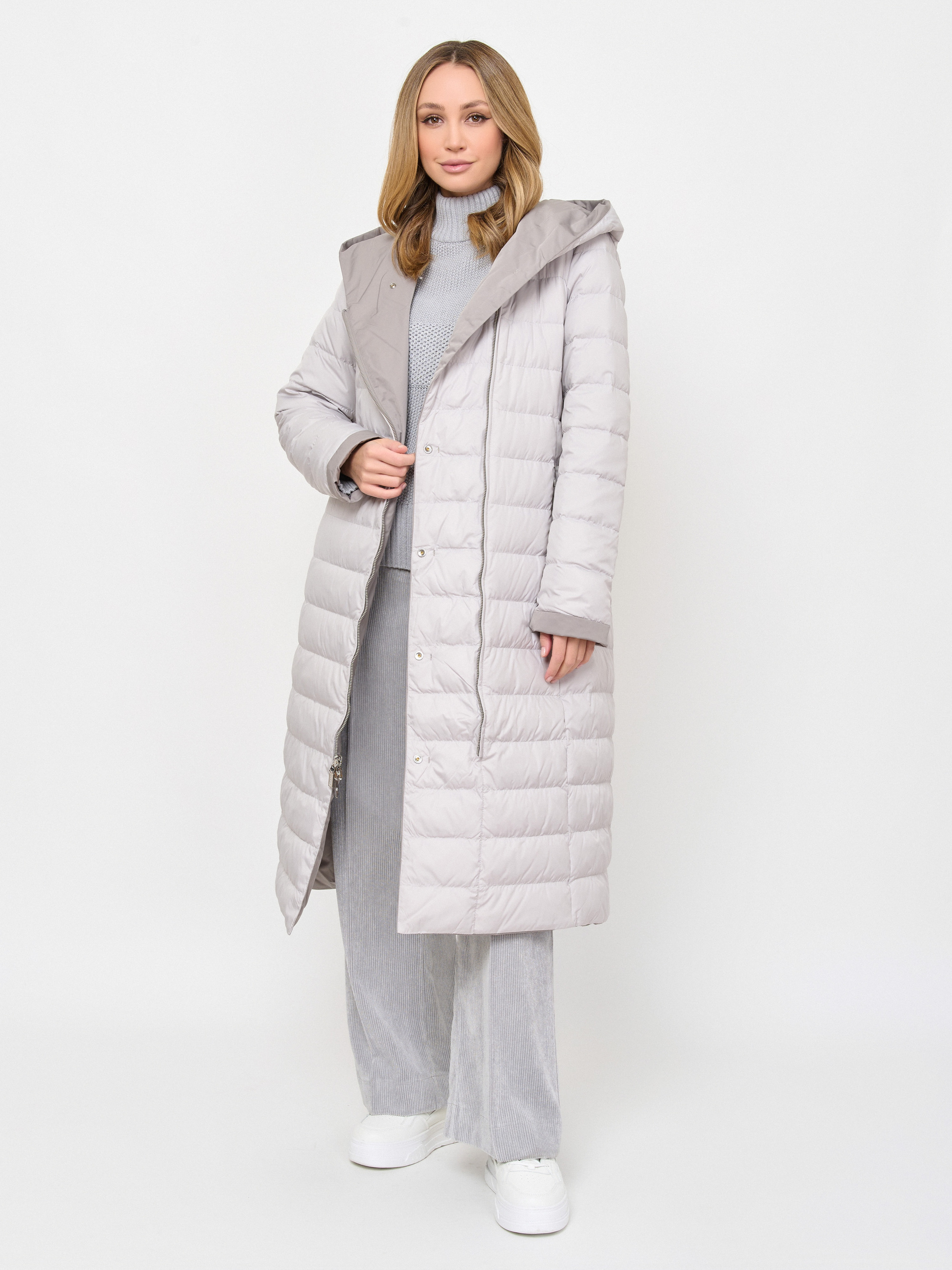 Двустороннее стёганое пальто, идеально подходящее для температурного диапазона от +5 до -10°C. Ткань верха - 100% полиэстер дымчато-жемчужного цвета; ткань 2 -100% полиэстер в бежевом цвете; утеплитель - 90% пух / 10% перо. Детали: застежка молния, опции капюшона несъемный капюшон, рукава длинные, покрой длинные, рисунок полуприталенный, утеплитель пух, карманы прорезные, без опушки, борты однобортное.