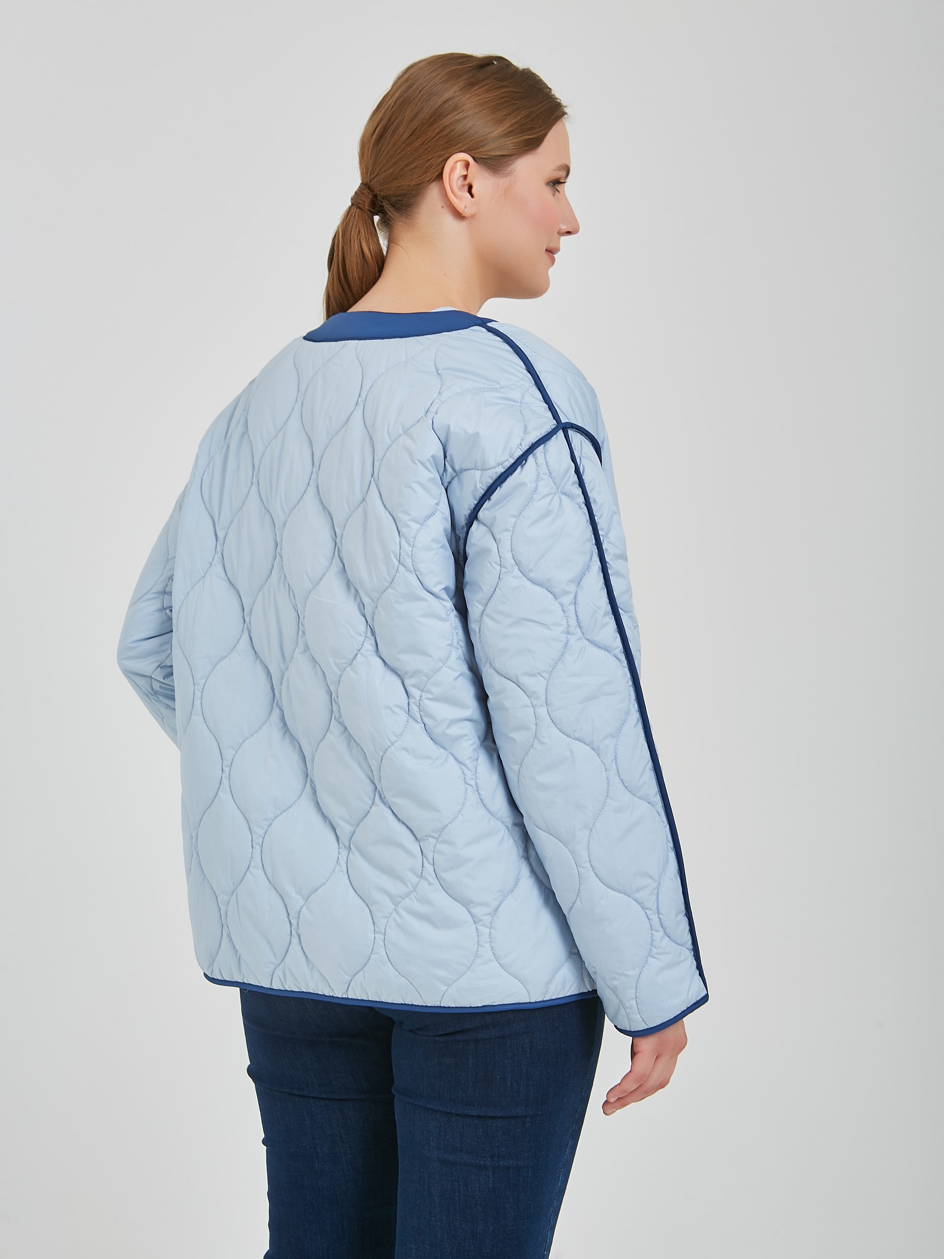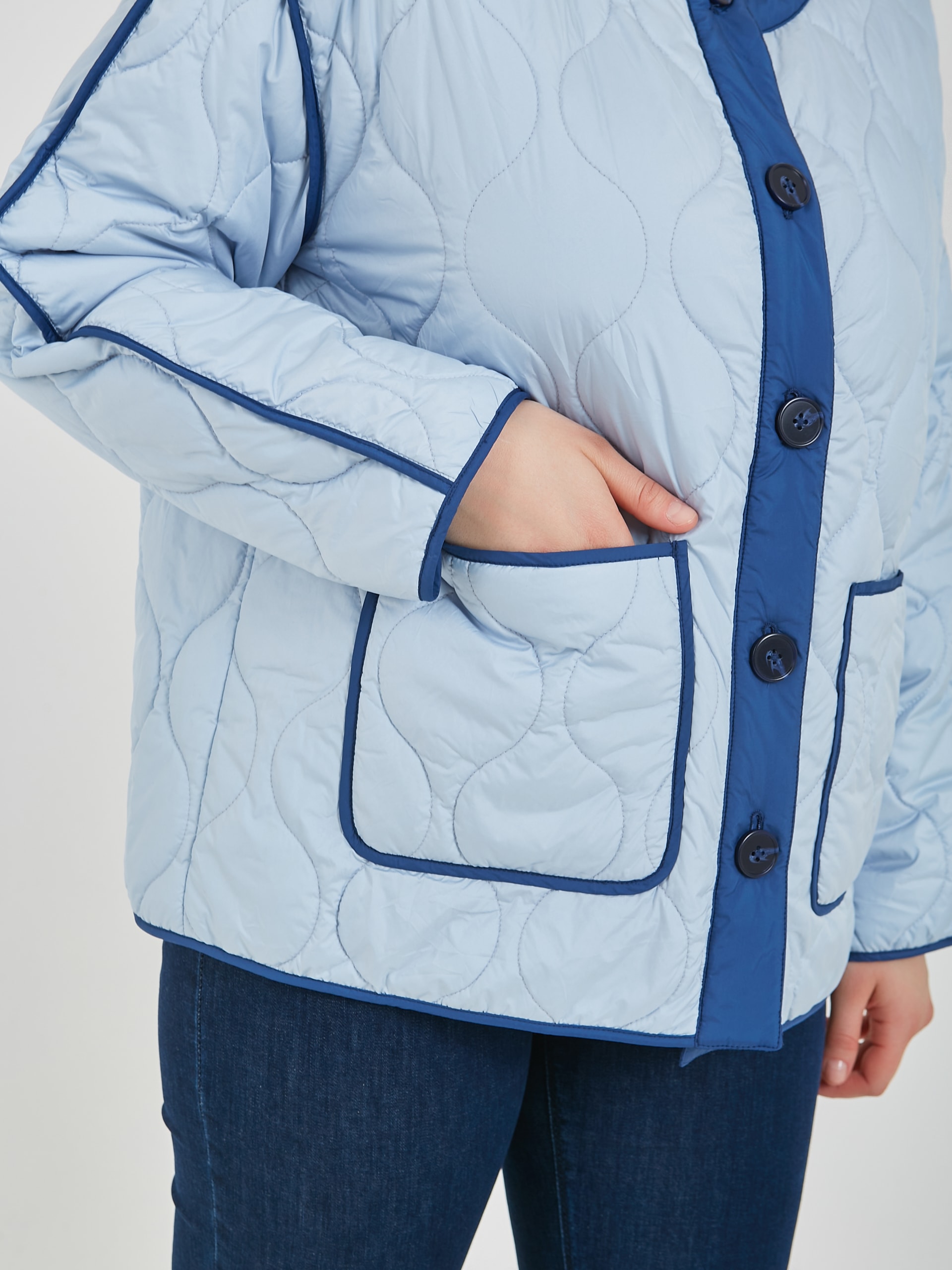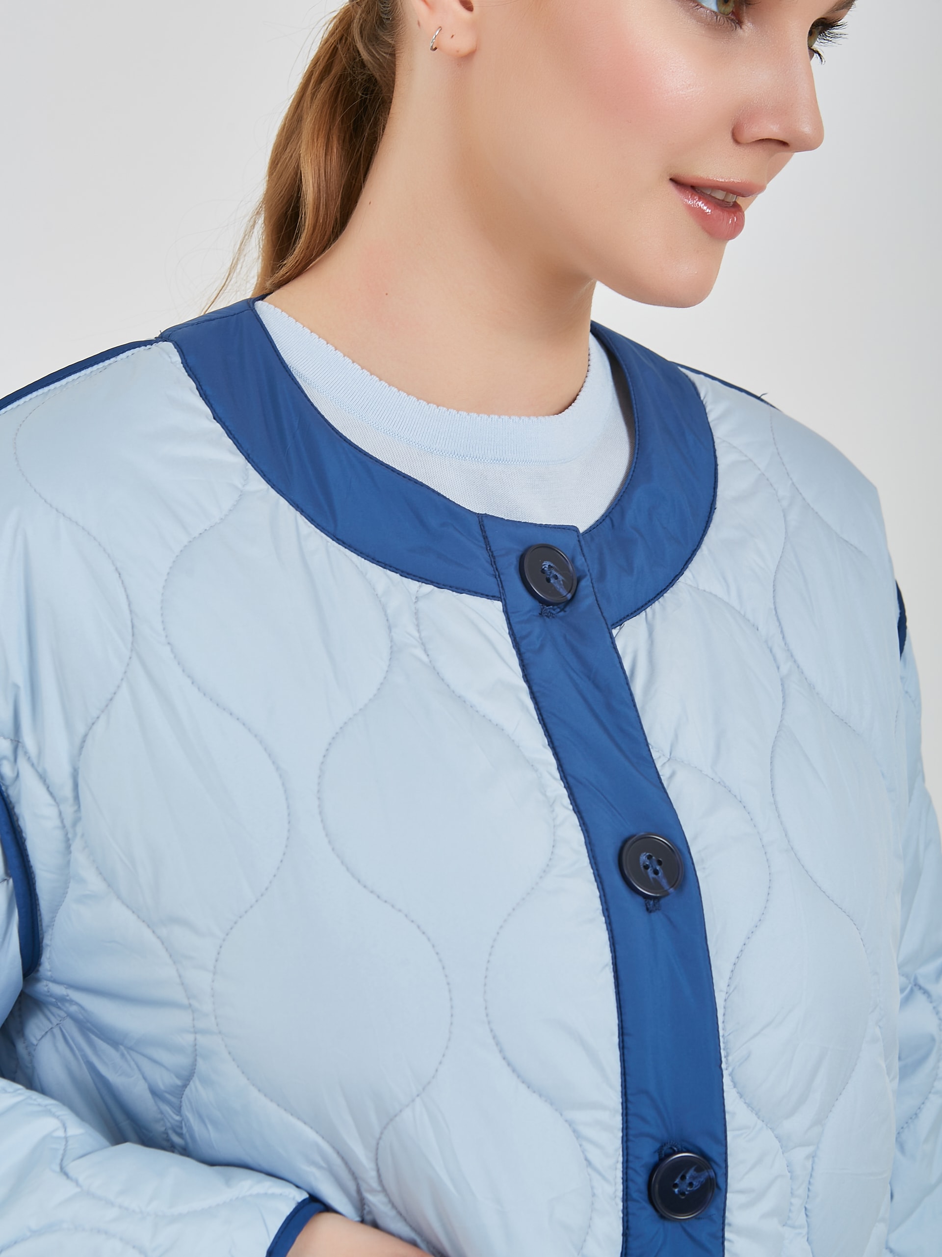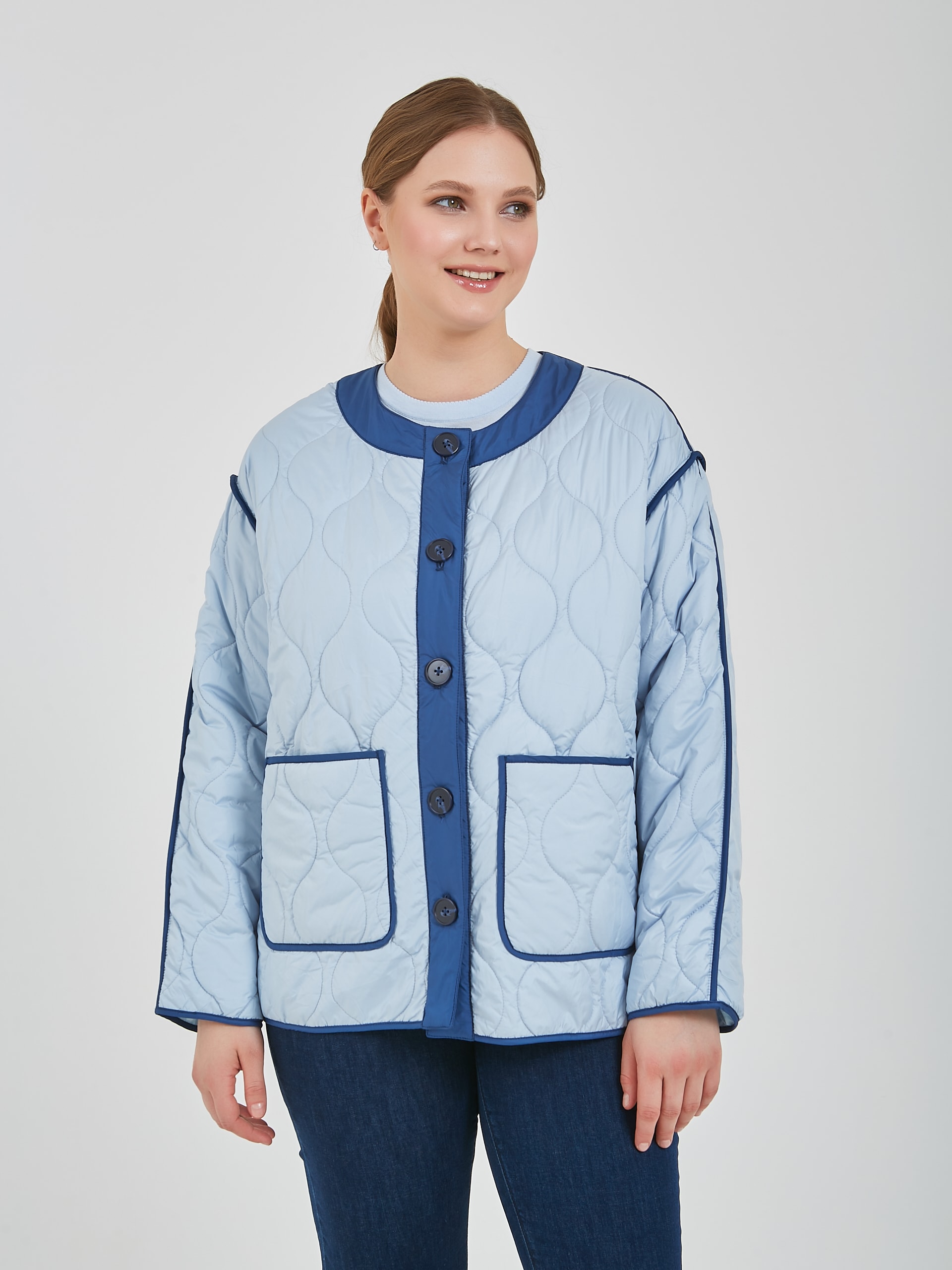 Женская утепленная куртка подарит тепло в прохладные дни. Женская куртка на пуговицах имеет удобный крой, стильный дизайн и практичность, который подходит для создания повседневных образов. Коллекция Весна-Лето 2025. Капсула "Санторини". Параметры модели: 95-64-101, рост 175, размер 44-46